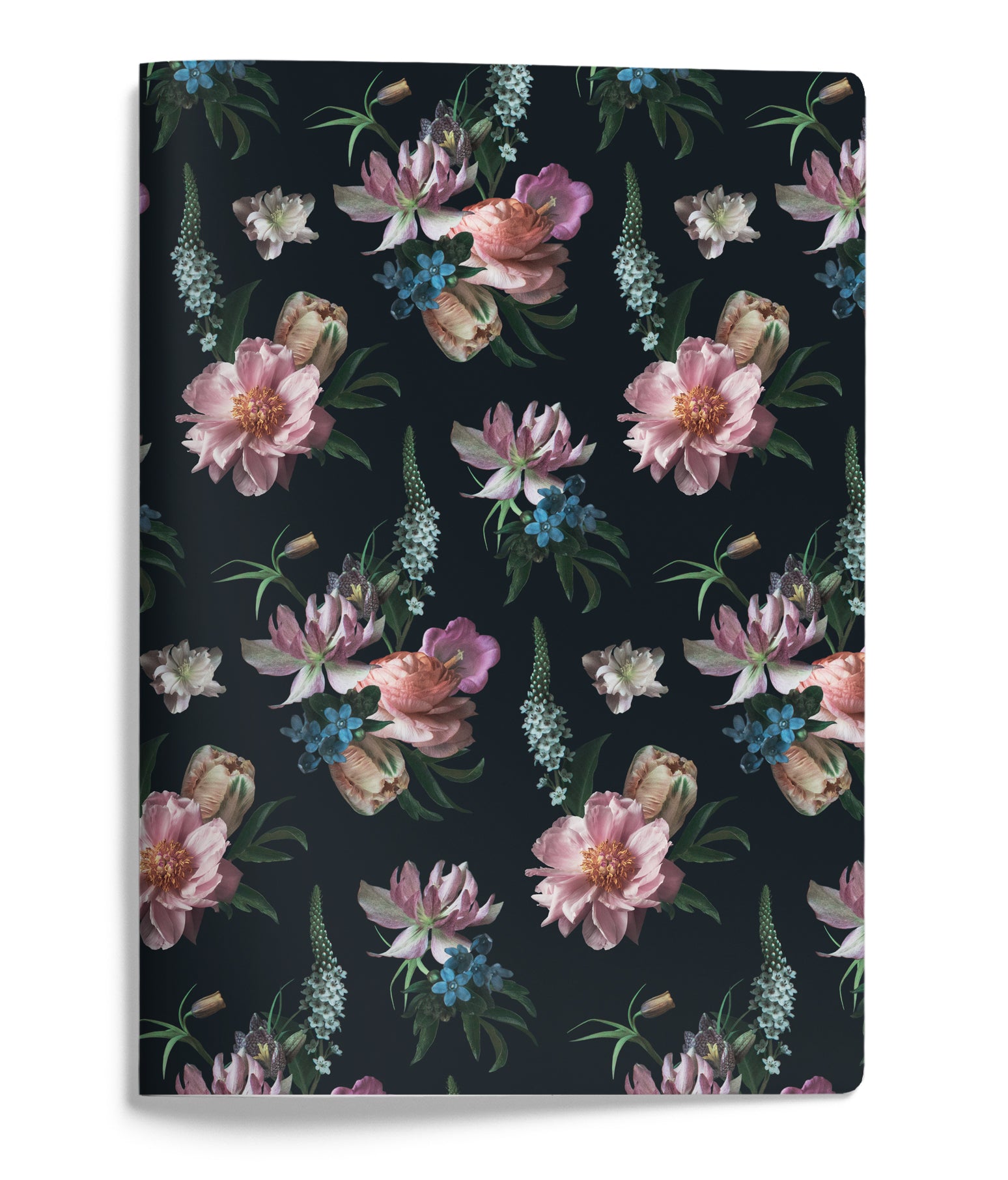 Softcover notebook (A4), high-quality paper. Printed inner cover, rounded corners. Cover image shows delicate pink and light blue flowers on a dark background. 56 blank pages, paper quality Serixo 100 g. Design: Kreetta Järvenpää.