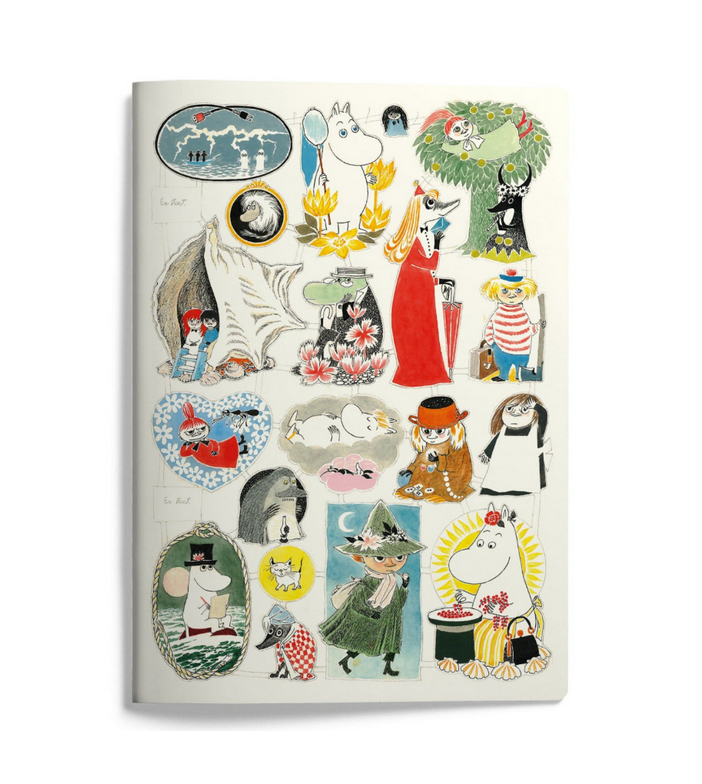 Softcover notebook (A4), high-quality paper. Printed inner cover, rounded corners. Cover image with Moomin characters in glossy images on a white background. 56 blank pages, paper quality Serixo 100 g. Design: © Moomin Characters™.