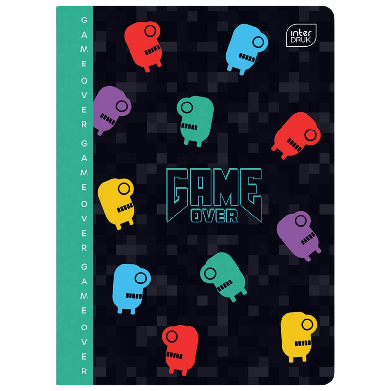 A5 sized square notebook with 32 pages. Paper thickness 70 g/m2. Part of Interdruk's Game Over product series. Space-themed illustration on the cover. Design: Interdruk.