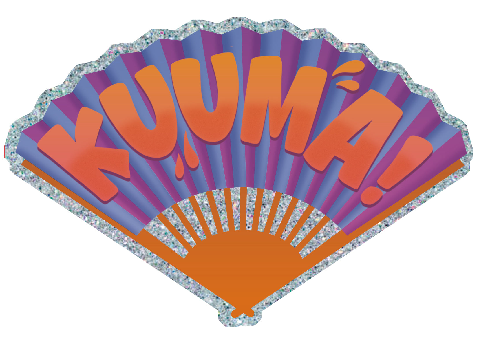 Vinyl sticker with the text "Kuuma!" on a fan-shaped background, in purple and orange, with glitter as an effect. Size approximately 9 x 9 cm. Printed in Finland. Design: Putinki Design.