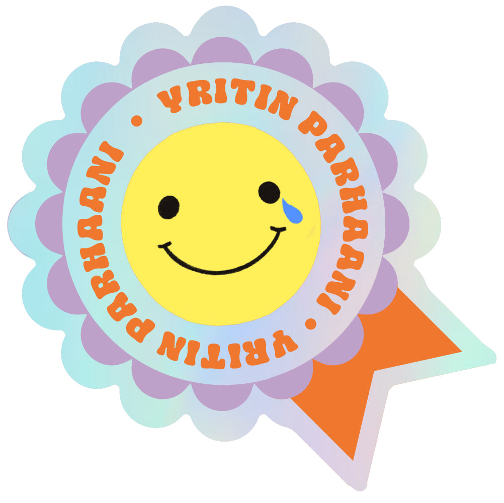 Vinyl sticker with a picture of a badge, a yellow smiley face and the text "yritin parhaani, yritin parhaani", with a hologram foil effect. Size approximately 9 x 9 cm. Printed in Finland. Design: Kaisu Sandberg.