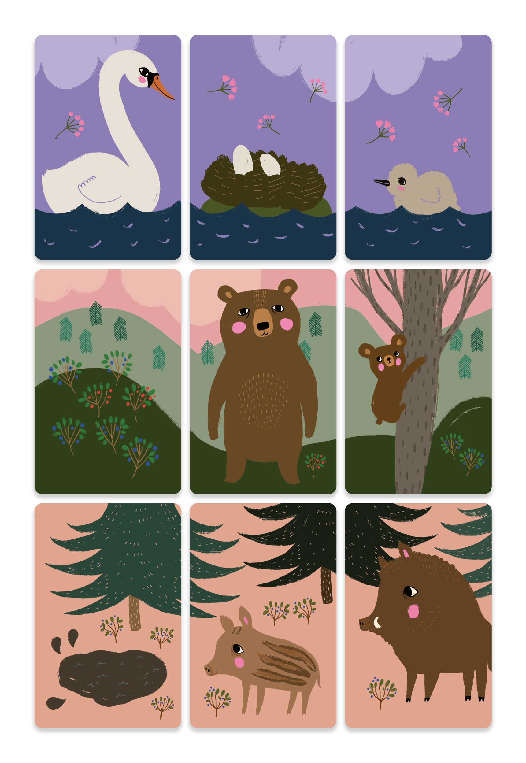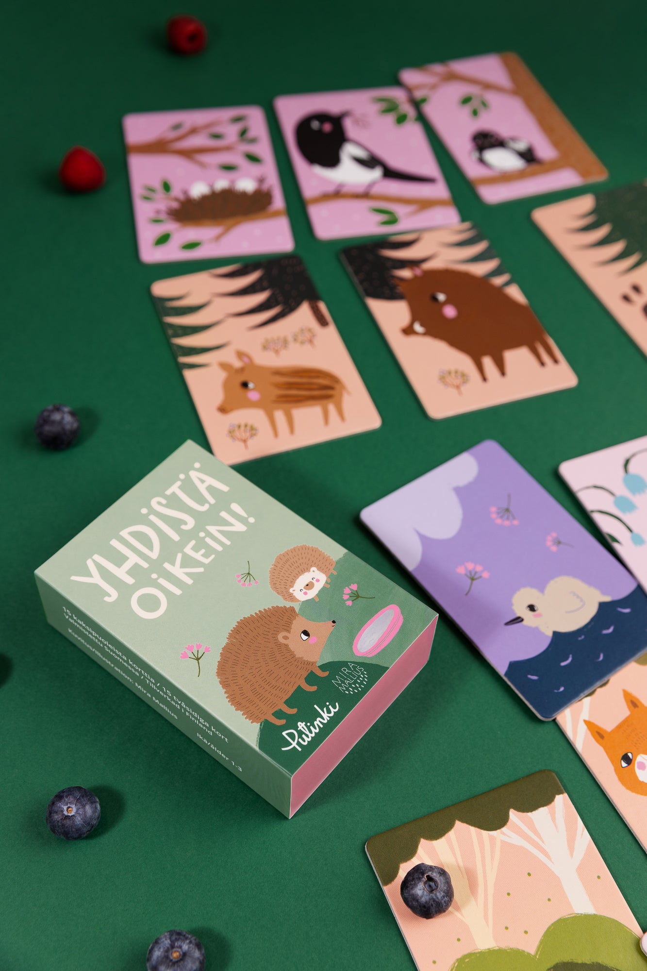 Match it right - children's game. Combine the three cards to make a complete picture. 15 cards, 10 ready-made picture sets. The cards have a double-sided illustration.