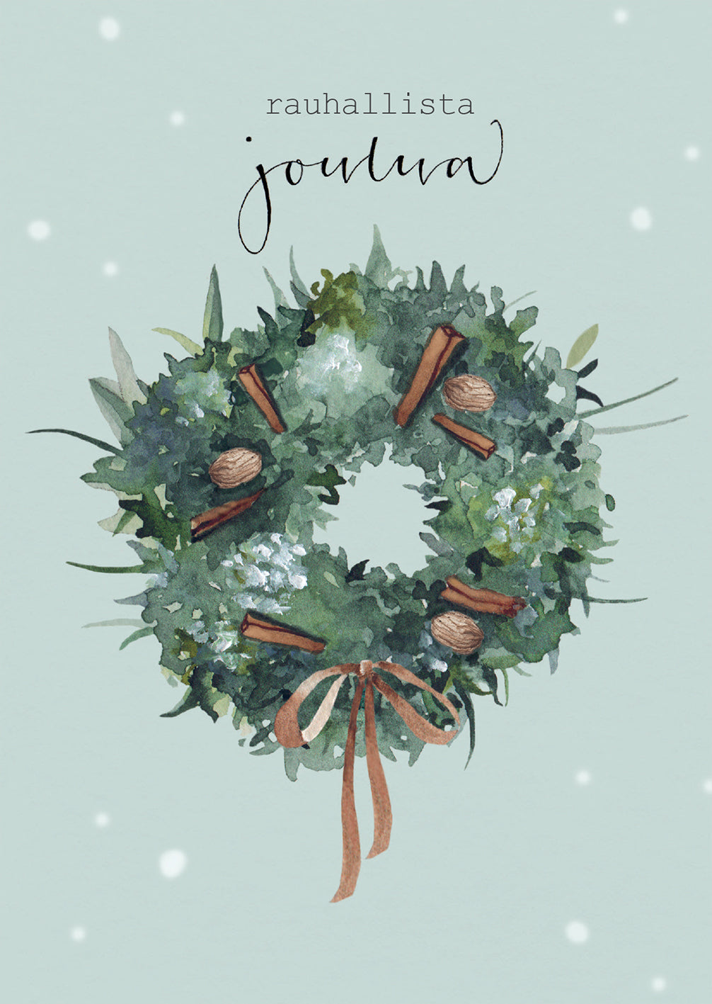 Kotimainen 2-osainen joulukortti laadukasta kartonkia. Kannessa kuva jouluisesta vihreästä kranssista, jossa koristeena kanelitankoja ja pähkinöitä sekä teksti "Rauhallista joulua". Kortti on sisältä tyhjä ja sisältää kirjekuoren. Henna Adelin herkät ja ainutlaatuiset kuvitukset ilahduttavat ja saavat joulumielen heräämään. Koko 105 x 148mm. Design Henna Adel.