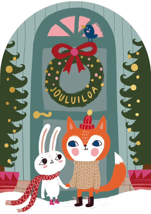 Kotimainen 2-osainen joulukortti laadukasta kartonkia. Kortin kuvassa on pupu ja kettu jouluoven edessä ja teksti "Jouluiloa". Kortissa on kaareva yläreuna, kultafolioidut yksityiskohdat, se on tekstitön sisältä ja sisältää kirjekuoren. Koko: 105 x 148 mm. Design: Mira Mallius.