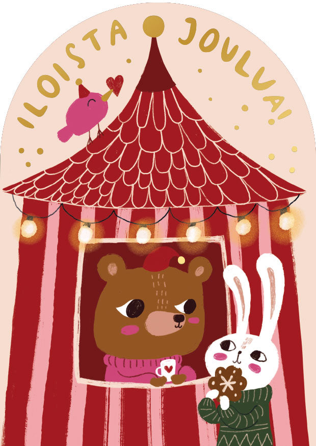 Kotimainen 2-osainen joulukortti laadukasta kartonkia. Kortin kuvassa on jouluinen myyntikoju joulumarkkinoilla, karhu ja pupu glögillä ja piparilla ja teksti "Iloista joulua". Kortissa on kaareva yläreuna, kultafolioidut yksityiskohdat, se on tekstitön sisältä ja sisältää kirjekuoren. Koko: 105 x 148 mm. Design: Mira Mallius.