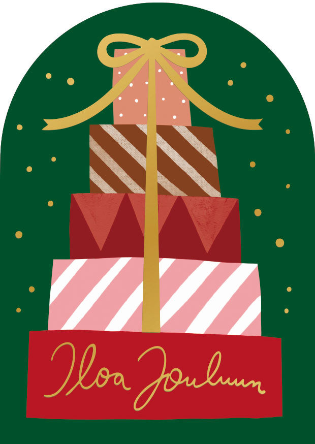 Kotimainen 2-osainen joulukortti laadukasta kartonkia. Kannessa kuva joululahjapaketeista ja teksti "Iloa jouluun". Kortissa on kaareva yläreuna, kultafolioidut yksityiskohdat, se on sisältä tyhjä ja sisältää kirjekuoren. Koko 105 x 148 mm. Design: Putinki Letters.