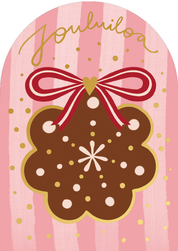 Kotimainen 2-osainen joulukortti laadukasta kartonkia. Kannessa on kuva joulupiparista ja teksti "Jouluiloa". Kortissa on kaareva yläreuna ja kultafolioidut yksityiskohdat, se on sisältä tyhjä ja sisältää kirjekuoren. Koko 105 x 148 mm. Design: Putinki Letters.
