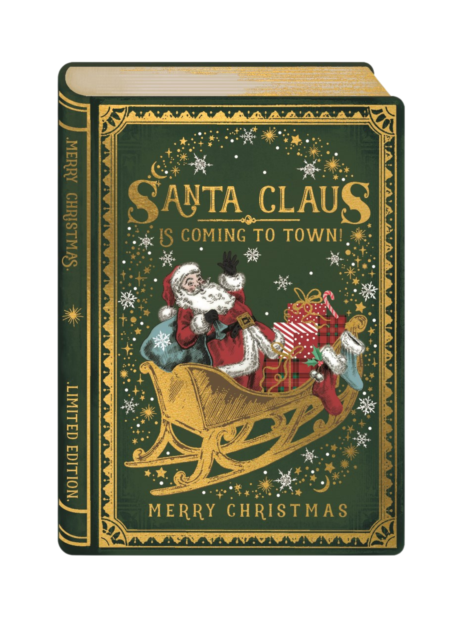 2-osainen joulukortti Story Book -sarjasta. Upea ja tunnelmallinen kirjan muotoinen kortti, jonka kannessa on jouluisen satukirjan kansikuvitus ja teksti "Santa Claus is Coming to Town, Merry Christmas". Koko: 120 x 170 mm. Tyhjä sisältä. Sisältää kullan värisen kirjekuoren. Design: The Art File.