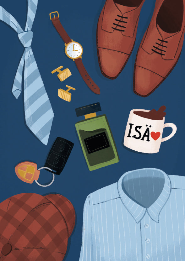 Kotimainen 2-osainen isänpäiväkortti, "Isä ❤" Tekstitön sisältä. Koko 105 x 148 mm. Sisältää ruskean kirjekuoren. Design: Kaisu Sandberg. Painettu Suomessa.