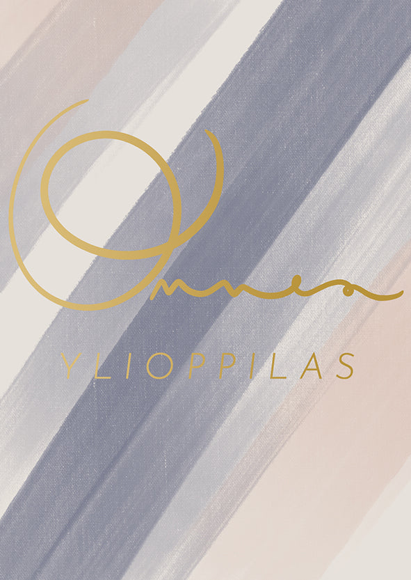 Kotimainen 2-osainen kortti, laadukasta kartonkia, sisältää kirjekuoren. Kannessa teksti "Onnea ylioppilaalle", tyhjä sisältä. Kortissa kultafolioidut yksityiskohdat. Koko 105 x 148 mm. Design: Putinki Letters. Painettu Suomessa.