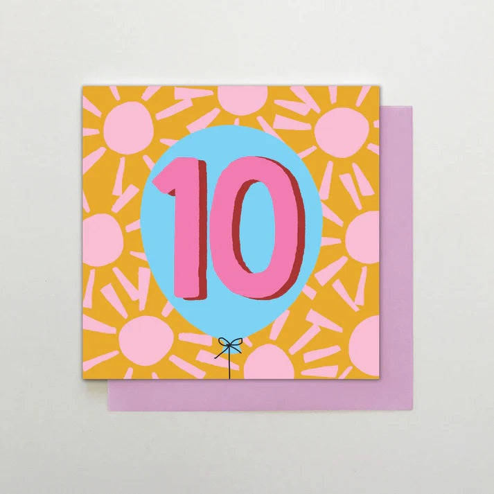 2-osainen neliökortti laadukasta kartonkia. Kortin kannessa on vaaleansinisessä ilmapallossa numero "10" ja oranssilla taustalla aurinkoja. Tekstitön sisältä. Koko 150 x 150 mm. Sisältää lilan kirjekuoren. Design: Stop the Clock Design.