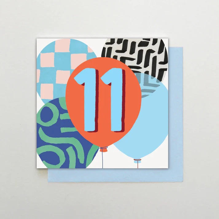 2-osainen neliökortti laadukasta kartonkia. Kortin kannessa on oranssissa ilmapallossa numero "11" ja taustalla ilmapalloja. Tekstitön sisältä. Koko 150 x 150 mm. Sisältää vaaleansinisen kirjekuoren. Design: Stop the Clock Design.
