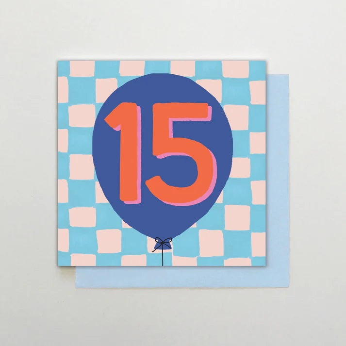 2-osainen neliökortti laadukasta kartonkia. Kortin kannessa on sinisessä ilmapallossa numero "15" ja taustalla ruutukuvio. Tekstitön sisältä. Koko 150 x 150 mm. Sisältää vaaleansinisen kirjekuoren. Design: Stop the Clock Design.