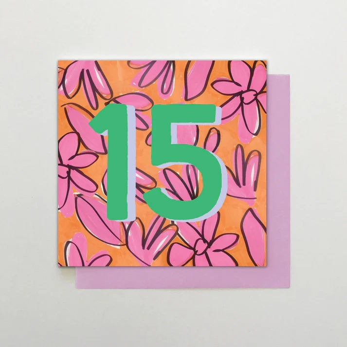 2-osainen neliökortti laadukasta kartonkia. Kortin kannessa on kukkakuvioisella taustalla vihreällä numero "15". Tekstitön sisältä. Koko 150 x 150 mm. Sisältää lilan kirjekuoren. Design: Stop the Clock Design.
