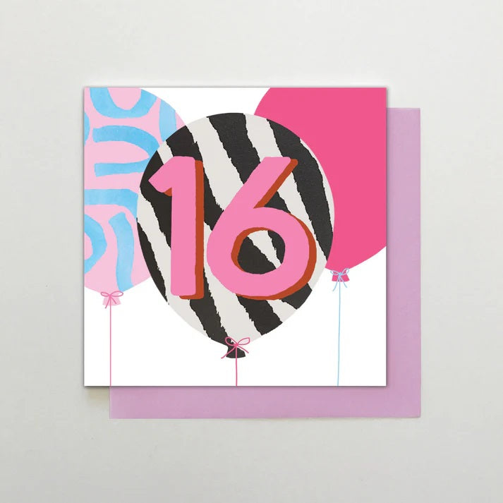 2-osainen neliökortti laadukasta kartonkia. Kortin kannessa on seepraraitaisesssa ilmapallossa numero "16" ja taustalla ilmapalloja. Tekstitön sisältä. Koko 150 x 150 mm. Sisältää lilan kirjekuoren. Design: Stop the Clock Design.