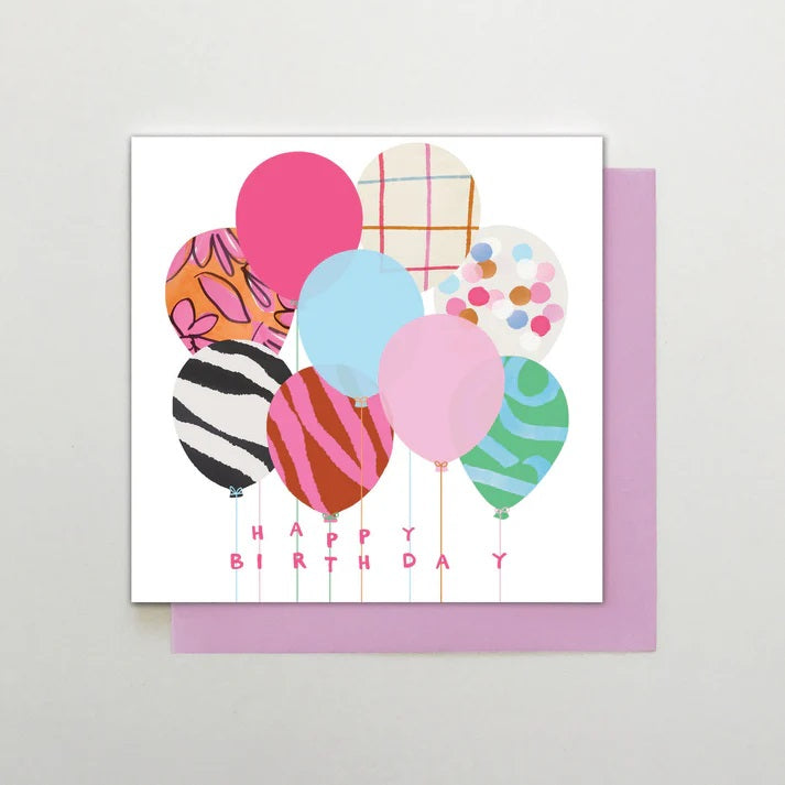 2-osainen neliökortti laadukasta kartonkia. Kortin kannessa värikkäitä kuviollisia ilampalloja valkoisella taustalla ja englanninkielinen teksti "Happy Birthday". Tekstitön sisältä. Koko 150 x 150 mm. Sisältää lilan kirjekuoren. Design: Stop the Clock Design.