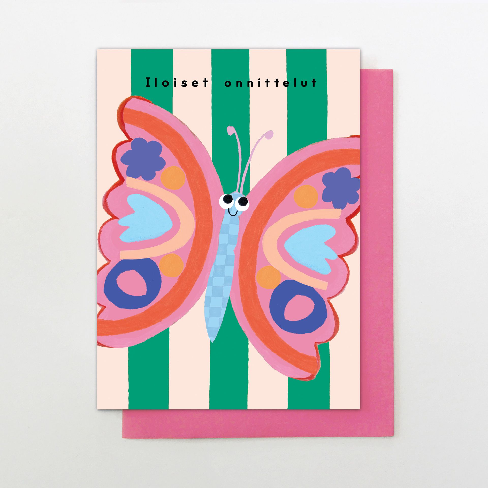 2-osainen kortti laadukasta kartonkia. Kortin kannessa värikäs iloinen perhonen, vihreä-valkoraitainen tausta ja teksti "Iloiset onnittelut". Tekstitön sisältä. Koko 125 x 175 mm. Sisältää vaaleanpunaisen kirjekuoren. Design: Stop the Clock Design.