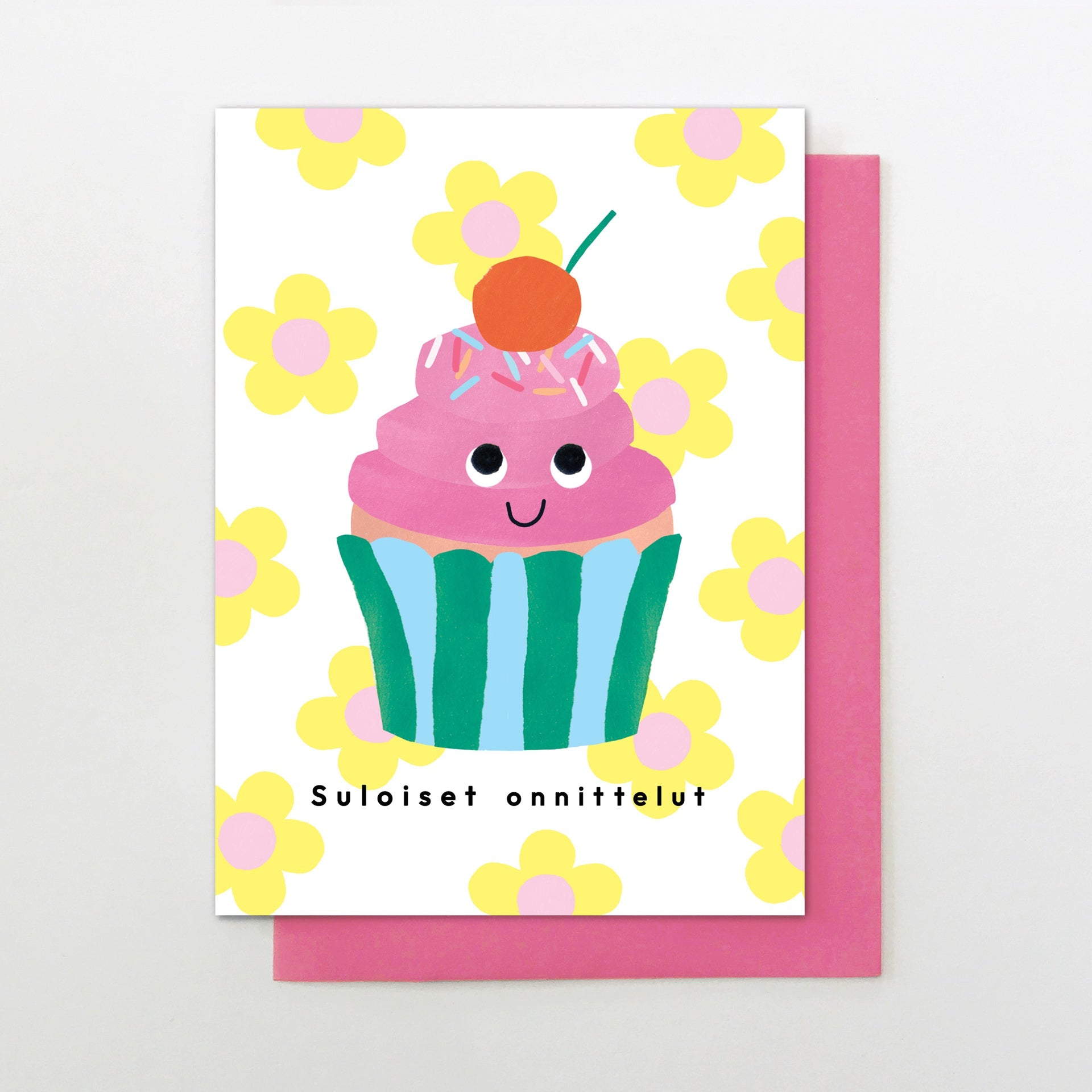 2-osainen kortti laadukasta kartonkia. Kortin kannessa kuva muffinssista, jonka päällä on kirsikka, taustalla keltaisia kukkia ja teksti "Suloiset onnittelut". Tekstitön sisältä. Koko 125 x 175 mm. Sisältää vaaleanpunaisen kirjekuoren. Design: Stop the Clock Design.