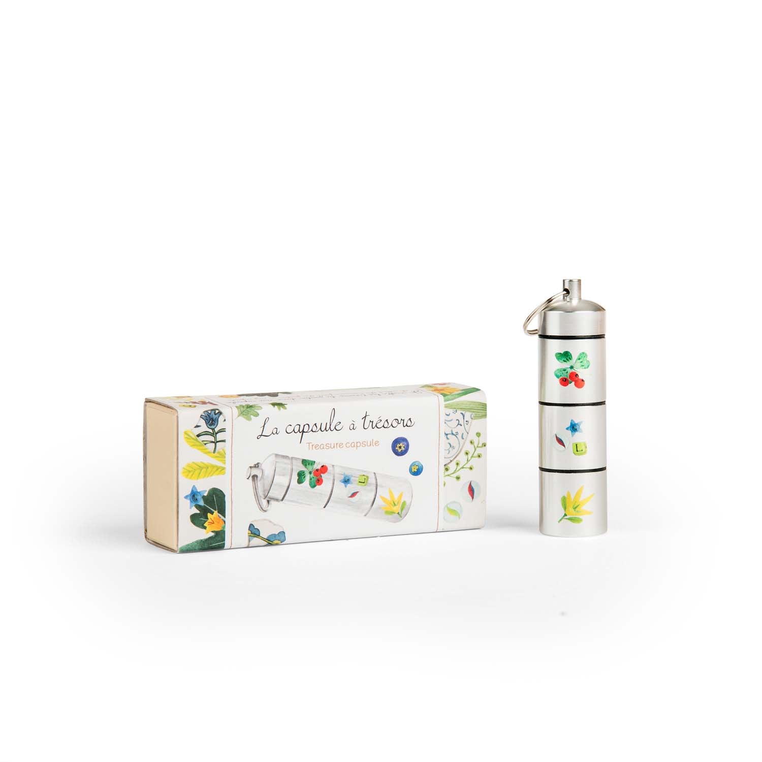 Aarrekätkö. Kapseli, jonka sisään voit laittaa aarteita. Kapselissa on kolme lokeroa, koko 2,5 x 9,5 cm. Suositus yli 3-vuotiaille. Design: Moulin Roty.