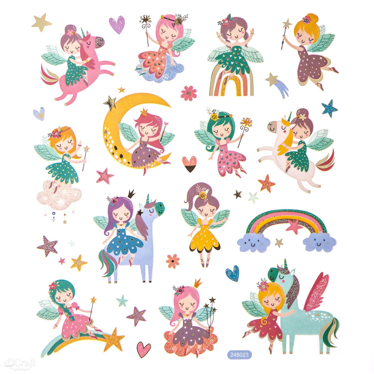 Ihastuttavia, värikkäitä paperitarroja, joissa aiheena on keijut ja maagiset yksisarviset. Tarroissa on koristeita, jotka on tehty opaalinhohtoisesta glitteristä ja kultaisista, metallisista yksityiskohdista. 23 tarraa pakkauksessa.