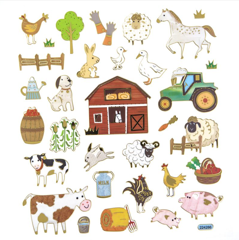 Kimaltavat maatila-aiheiset tarrat sopivat täydellisesti kaikenlaiseen askarteluun sekä koristeluprojekteihin, kuten korttien tekoon, scrapbookingiin, lahjapaketointiin ja muuhun.