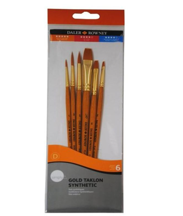 Lyhytvartiset Daler-Rowney Gold Taklon-keinokuitusiveltimet kaikille maalaustekniikoille. Lajitelmassa pyöreät 1, 3, 5 sekä latta 4, 2, 6.