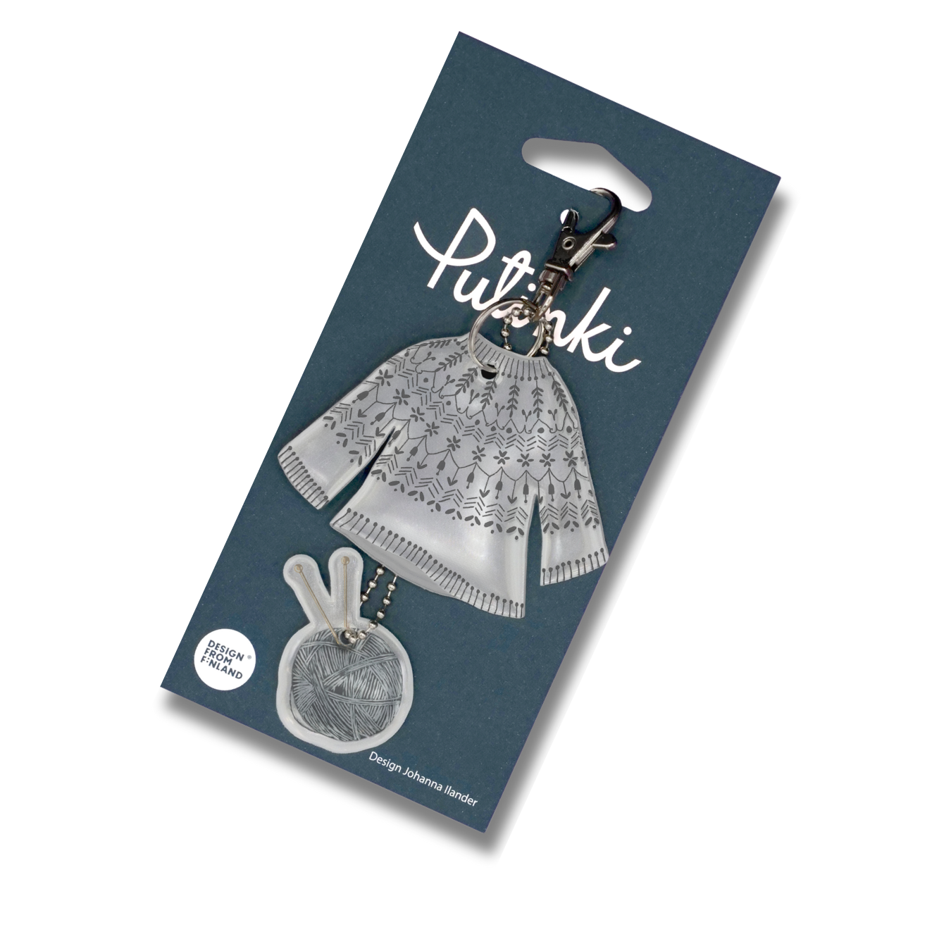 Suomalainen design heijastin, aiheena kirjoneule ja lankakerä. Sisältää papukaijalukon ja palloketjun. Heijastin on CE (EN 13356)-merkitty. Tyyppitarkistettu, heijastin täyttää EU:n henkilönsuojainasetuksen 2016/425. Sisältää pieniä osia, ei sovellu alle 3-vuotiaille. Koko: 7 x 9 cm. Palloketju: 7 cm. Design: Johanna Ilander. Valmistettu Suomessa.