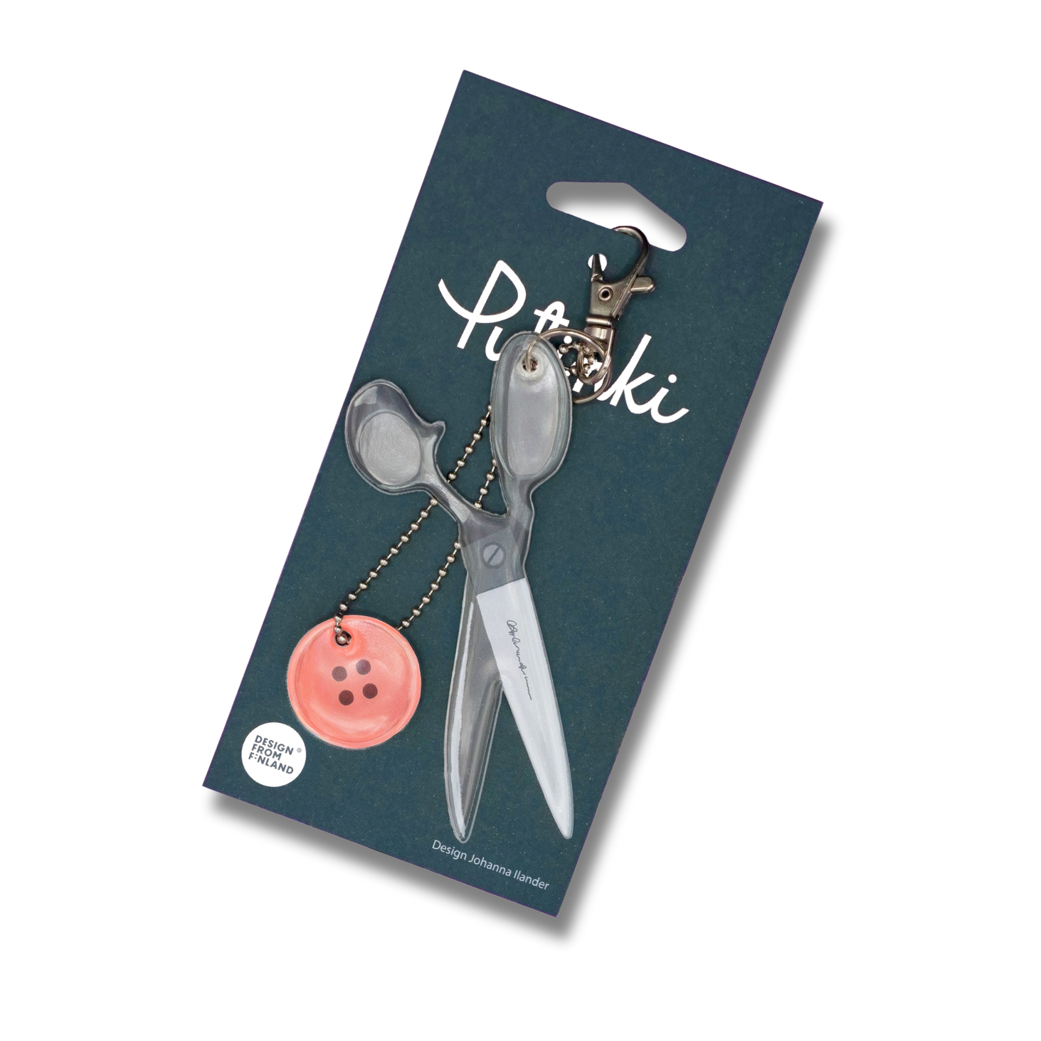 Suomalainen design heijastin, aiheena sakset ja nappi. Sisältää papukaijalukon ja palloketjun. Heijastin on CE (EN 13356)-merkitty. Tyyppitarkistettu, heijastin täyttää EU:n henkilönsuojainasetuksen 2016/425. Sisältää pieniä osia, ei sovellu alle 3-vuotiaille. Koko: 7 x 9 cm. Palloketju: 7 cm. Design: Johanna Ilander. Valmistettu Suomessa.