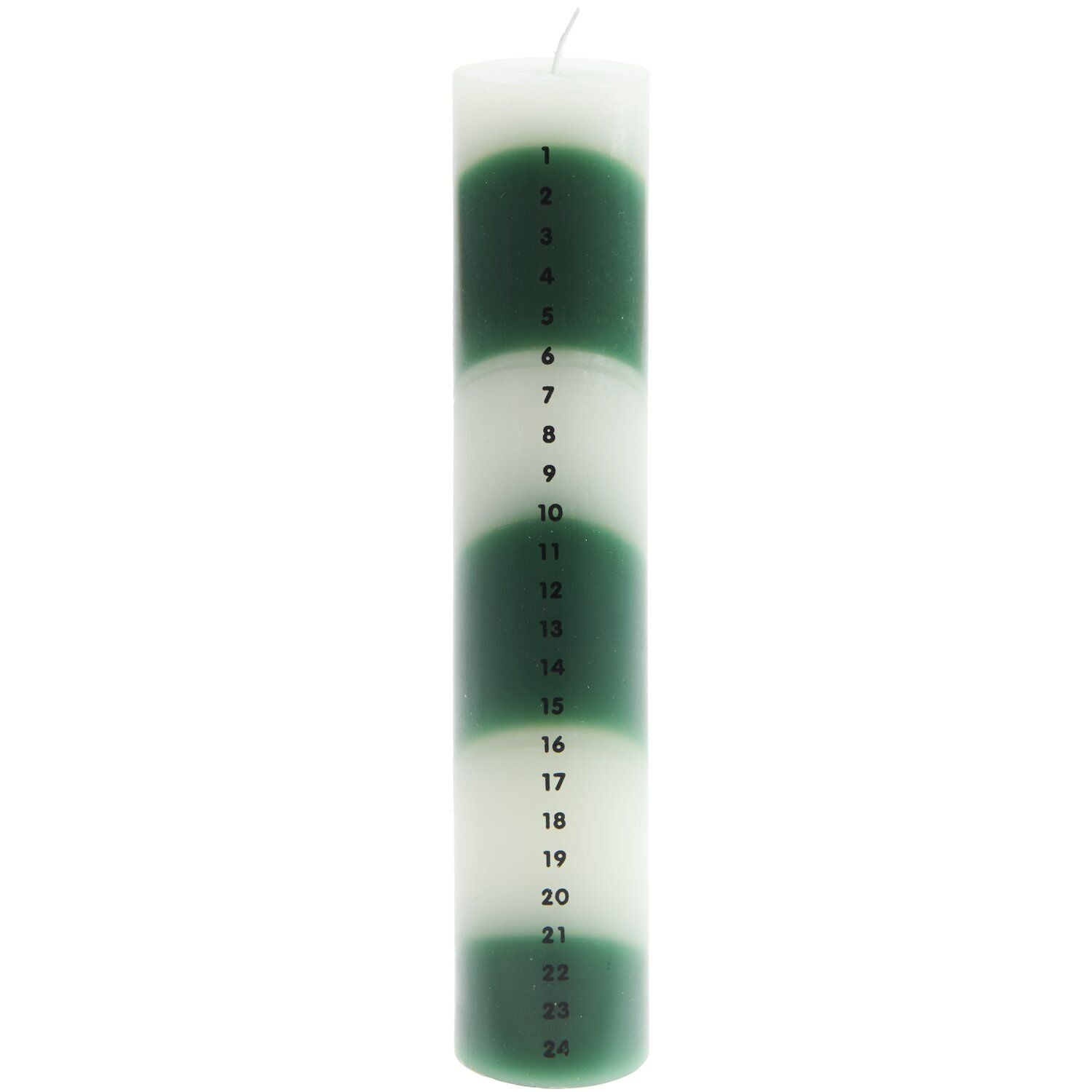 Vihreä-valkoraitainen joulukalenterikynttilä. Kynttilä on tehty parafiinista ja siinä on kyljessä numerot 1-24. Kynttilän korkeus on 20cm ja halkaisija noin 4cm. Voit polttaa kynttilää joulukuun jokaisena päivänä yhden numeron verran jouluaattoon saakka, ja laskea samalla päiviä jouluun. Turvallisuusohjeet: Älä koskaan jätä palavaa kynttilää yksin ilman valvontaa. Älä sijoita kynttilää lämmönlähteiden lähelle, sillä parafiini pehmenee yli 30 c° lämmössä. Älä sijoita palavaa kynttilää lasten ja lemmikkieläinten ulottuville. Älä koskaan sijoita kynttilää tulenarkojen materiaalien läheisyyteen tai alle.