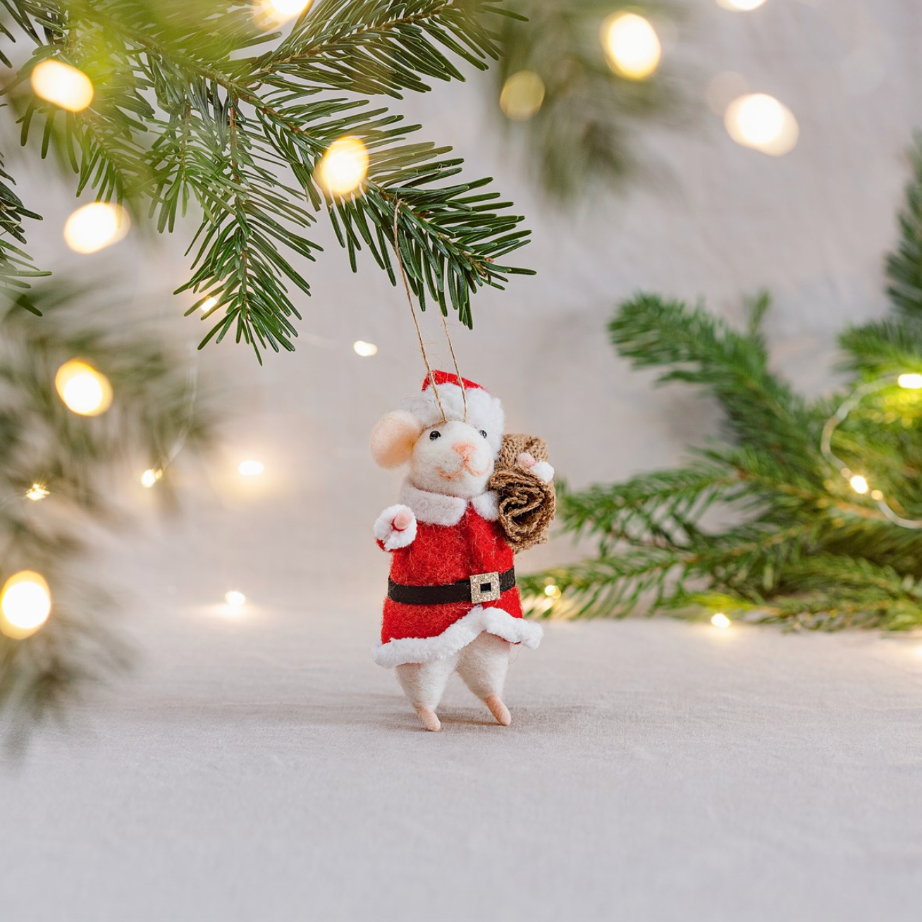 Tuo kotiisi ripaus hauskuutta tänä jouluna Joulupukkihiiri -ripustuskoristeella. Punaisen ja valkoisen sävyinen, pehmeä ja suloinen huopakoriste on suunniteltu ripustettavaksi kuuseen.