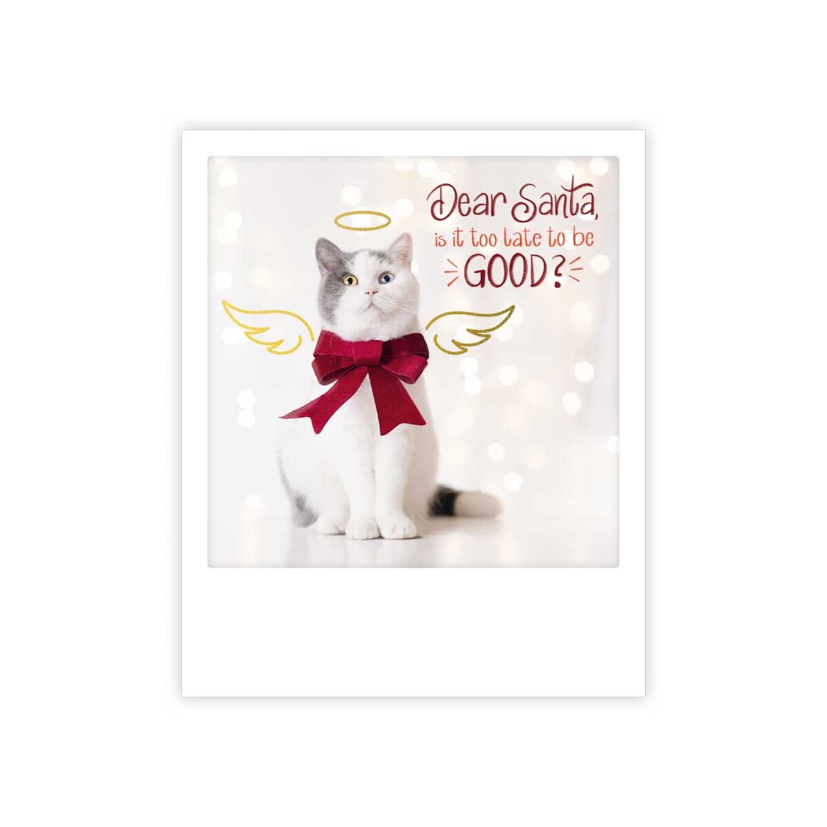 1-osainen joulukortti laadukasta lakattua kartonkia. Kuvassa kissa rusetti kaulassa ja sädekehä pään päällä, tekstinä "Dear Santa, is it too late to be good?". Koko 105 x 130 mm. Valmistaja: Pickmotion.