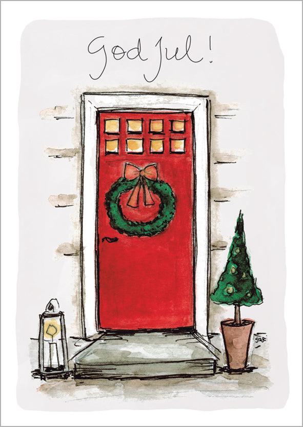 Kotimainen 1-osainen joulukortti laadukasta kartonkia. Kortin kuvassa on punainen jouluovi sekä ruotsinkielinen teksti "God jul!". Koko 105 x 148 mm. Design: Sari's Artwork.