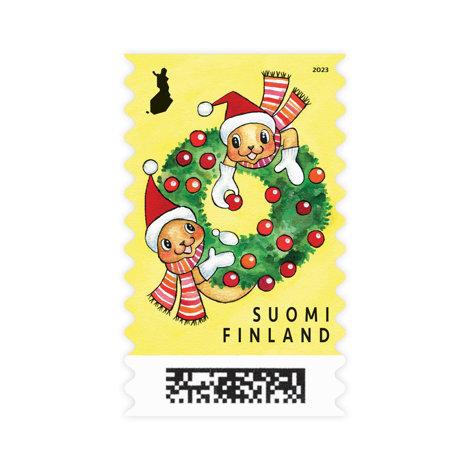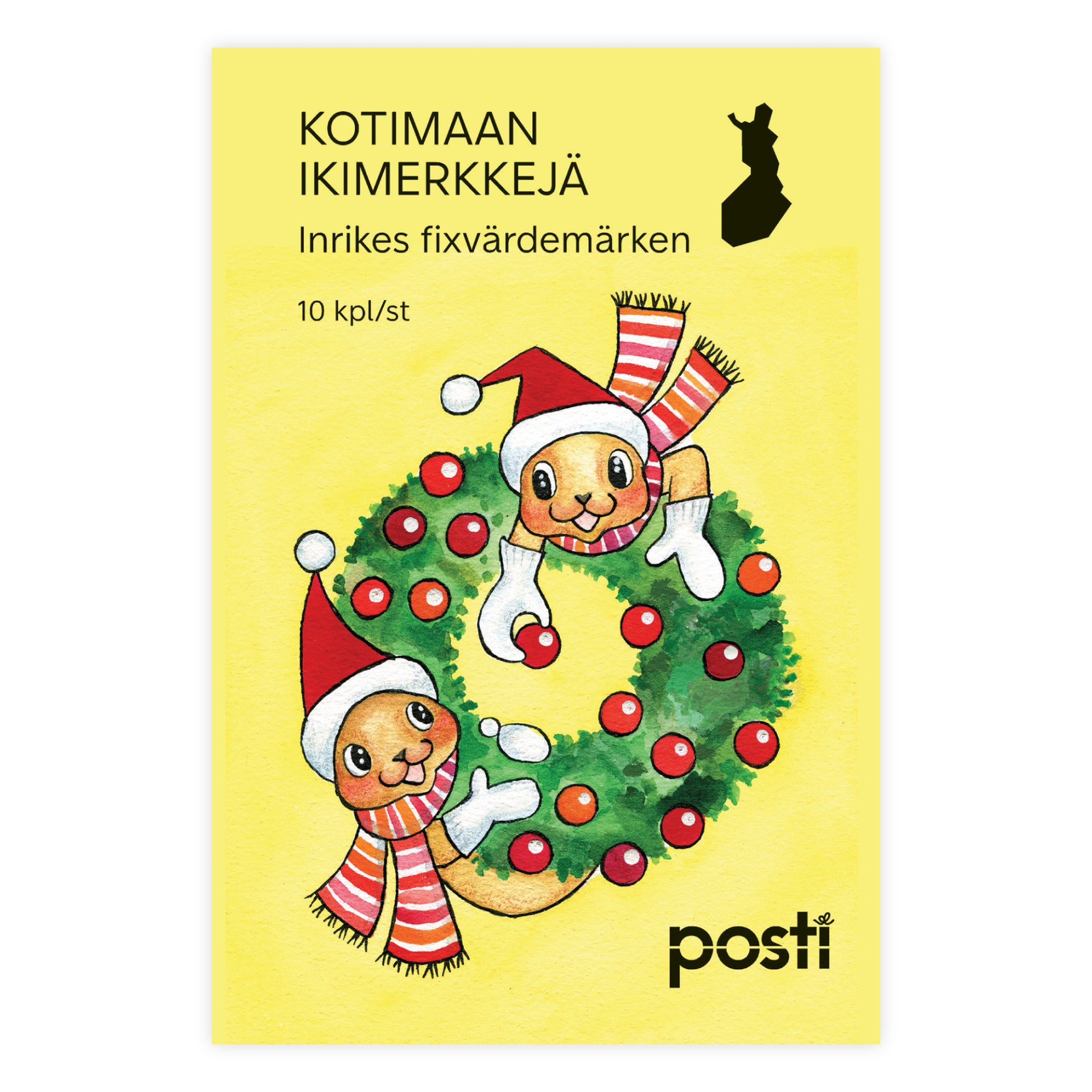 Tänä vuonna joulupostimerkit tuovat mukanaan Minna Lehväslaihon iloiset eläinhahmot. Kotimaan ikimerkissä näemme touhukkaita oravia joulukranssissa. Joulukranssi ikimerkit myydään 10 kpl arkeissa. Älä unohda, että joulupostimerkeissä on 2D-koodi, joka tekee lähetyksen lajittelusta entistä sujuvampaa. Kotimaan ikimerkki on kätevä tapa lähettää kirjeet ja kortit kotimaassa. Ikimerkki on voimassa aina, ja yhdellä merkillä voit postittaa enintään 50 grammaa painavan kirjeen. Painavampiin kirjeisiin tarvitset useamman ikimerkin. Välitä joulukorttisi joulukranssi-ikimerkillä!