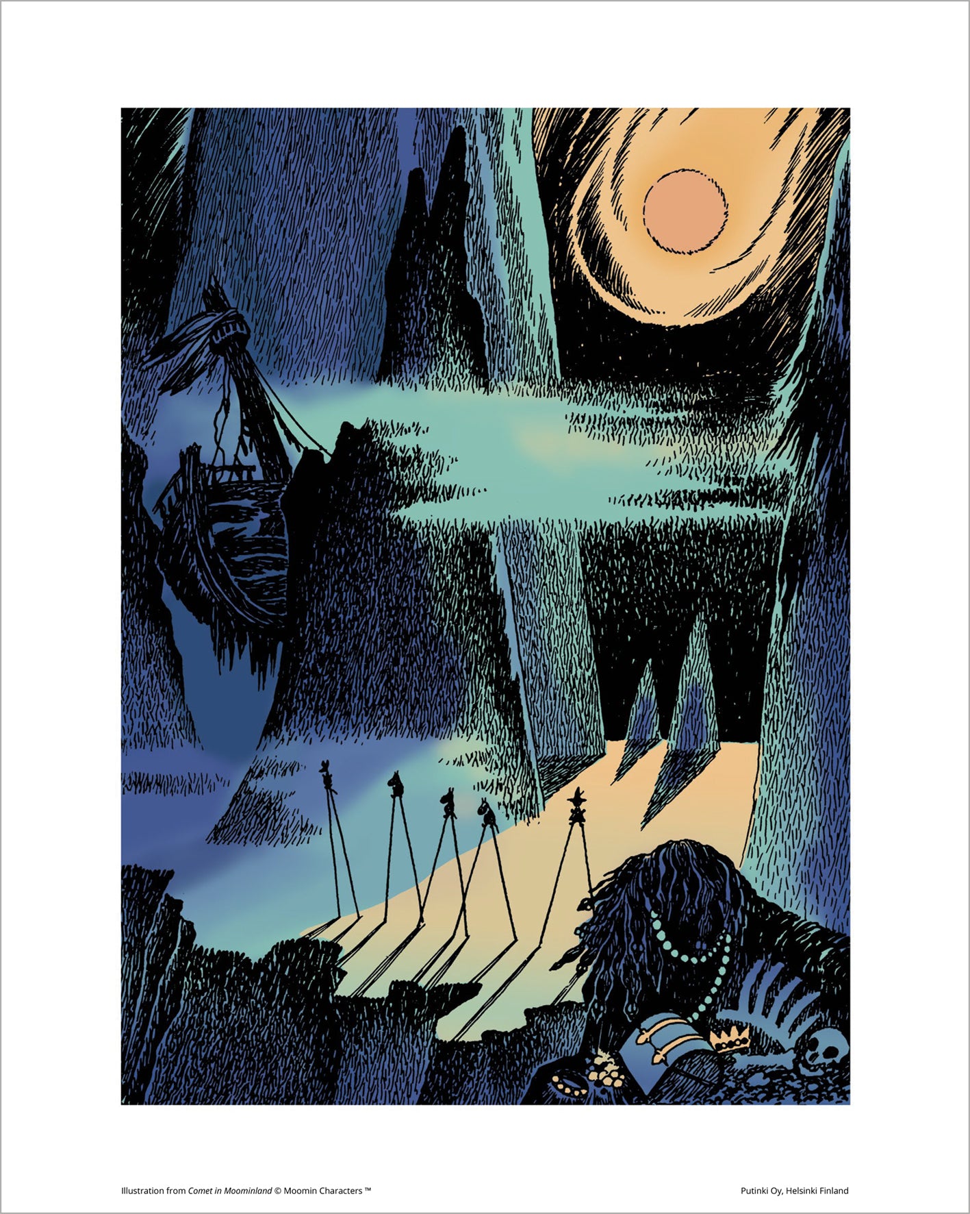 Kotimainen muumi-juliste. Julisteen kuvassa on öinen sinisävyinen maisema sumuisilta vuorilta, jossa Muumihahmot kävelevät puujaloilla vuorten välissä ja keltainen pyrstötähti loimottaa taivaalla. Perustuu alkuperäiseen kuvaan Tove Janssonin kirjasta Muumipeikko ja pyrstötähti. Painettu laadukkaalle mattapintaiselle 240g Munken Lynx paperille. Koko 24 x 30 cm. © Moomin Characters™