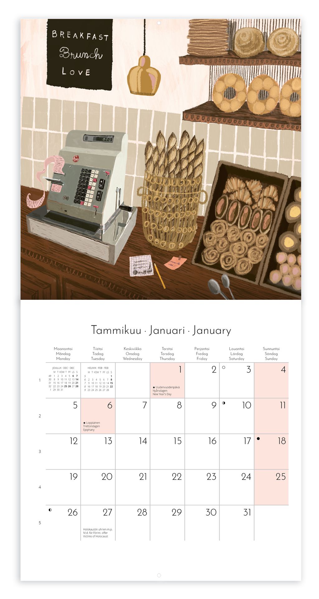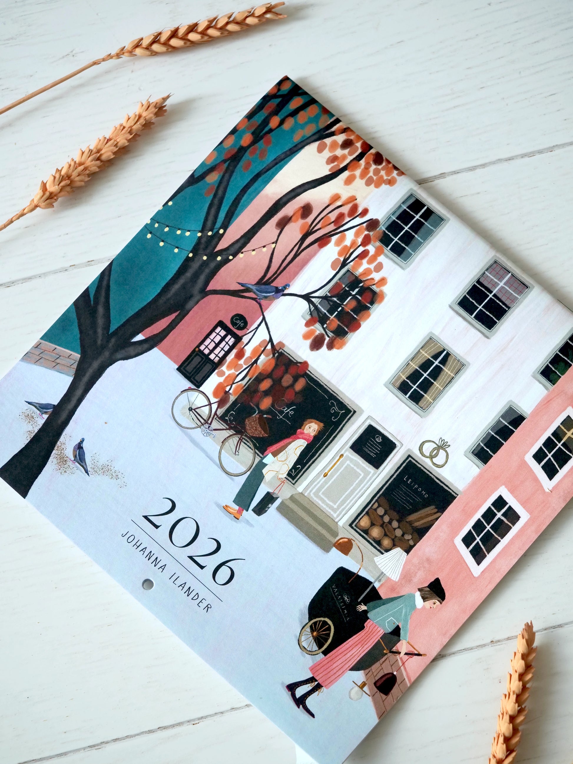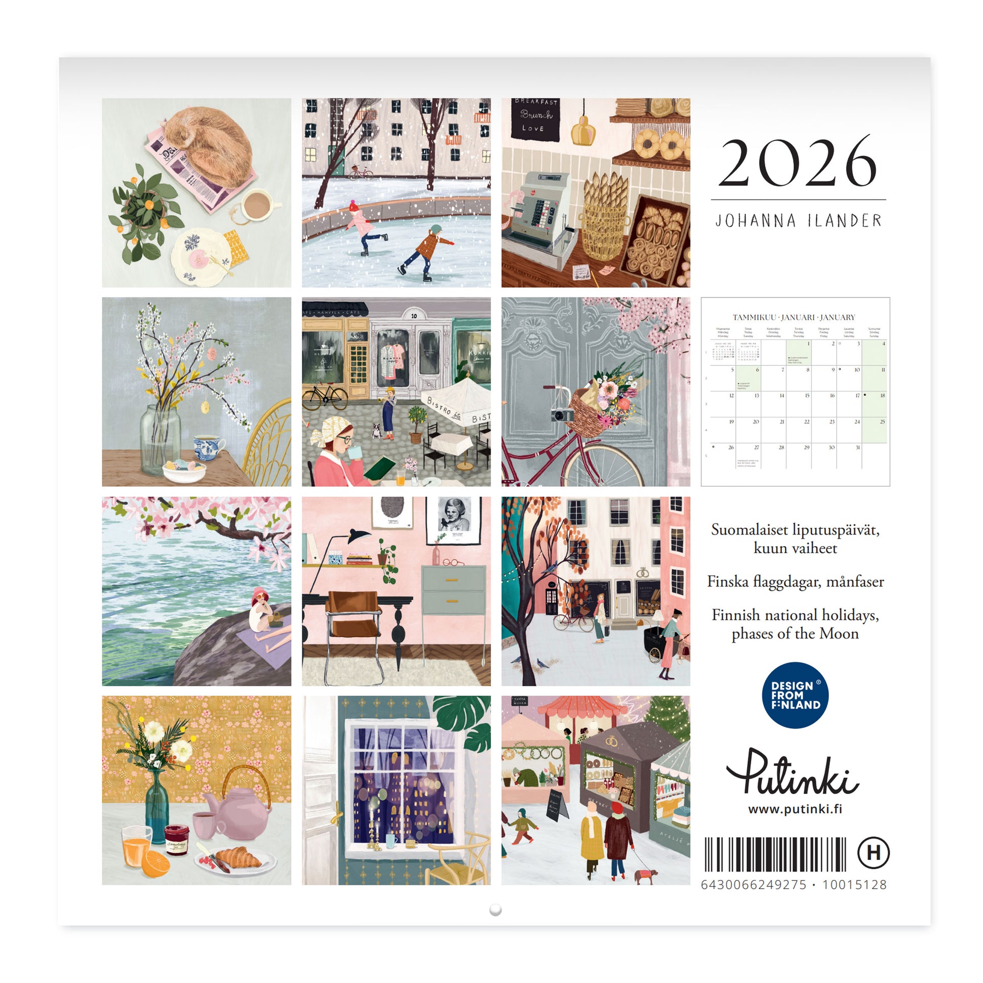 Seinäkalenteri vuodelle 2026 Johanna Ilanderin kuvituksilla. Kansikuvassa on leikkisästi tyylitelty kaupunkimaisema, kerrostaloja ja pieni aukio jossa kaksi ihmistä, polkupyörä ja puu, sekä vuosiluku 2026. Koko 20 x 20 cm. Kielet: suomi, ruotsi ja englanti. Sisältää suomalaiset ja suomenruotsalaiset liputuspäivät, sekä kuun vaiheet. Kalenterin alussa on yhdellä aukeamalla kuukaudet loka-, marras- ja joulukuu 2025. Sen voi siis ottaa jo käyttöön lokakuussa 2025!
