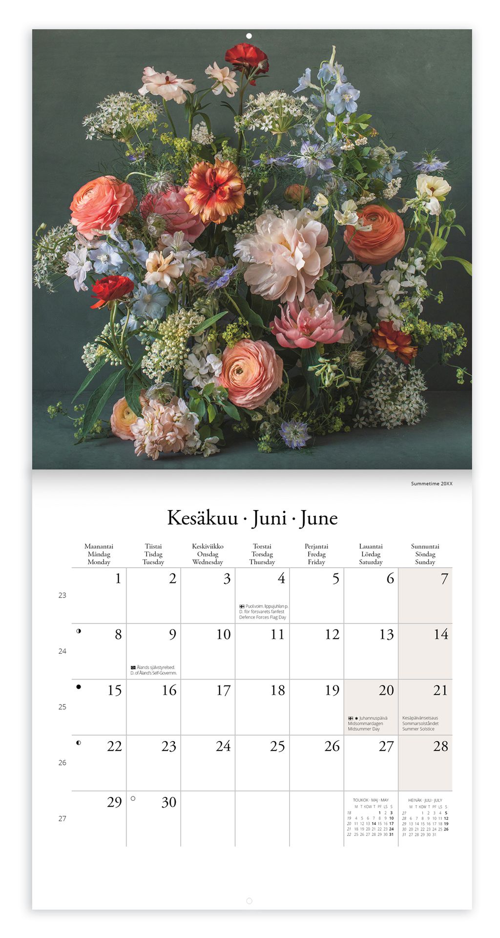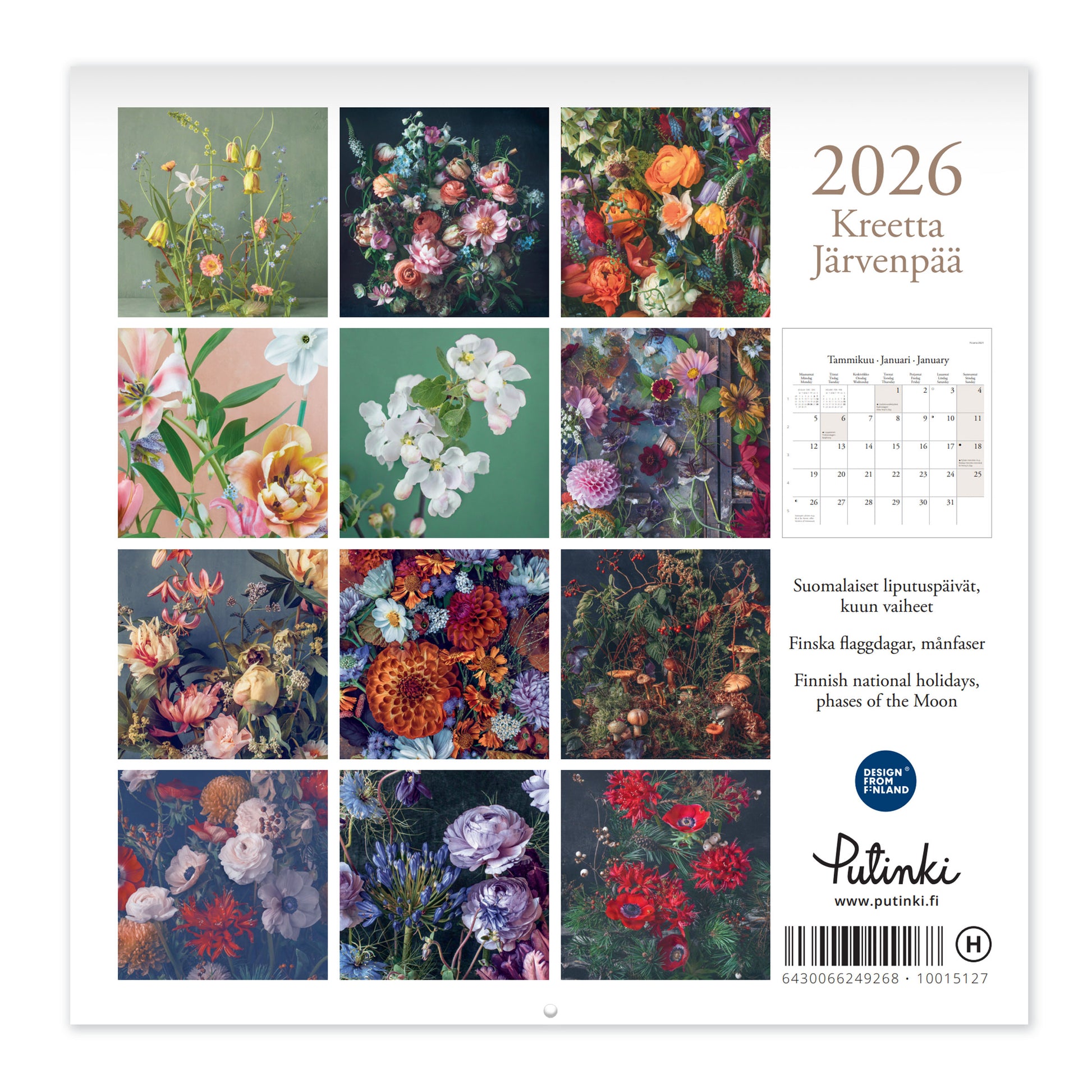 Pieni seinäkalenteri vuodelle 2026 tehty yhteistyössä valokuvaaja Kreetta Järvenpään kanssa. Kreetta Järvenpää -kalenteri on täynnä hurmaavan tunnelmallisia ja runsaista kukkakuvia. Kanessa teos "Whispering" vuodelta 2020, runsaassa asetelmassa on pioneja, jaloleinikkejä, tulppaaneja, lemmikkejä, kellokukkia ja muita värikkäitä kukkia. Kielet: suomi, ruotsi ja englanti. Sisältää suomalaiset ja suomenruotsalaiset liputuspäivät, sekä kuun vaiheet. Koko 20 x 20 cm. Kalenterin alussa on yhdellä aukeamalla kuukaudet loka-, marras- ja joulukuu 2025. Sen voi siis ottaa jo käyttöön lokakuussa 2025!