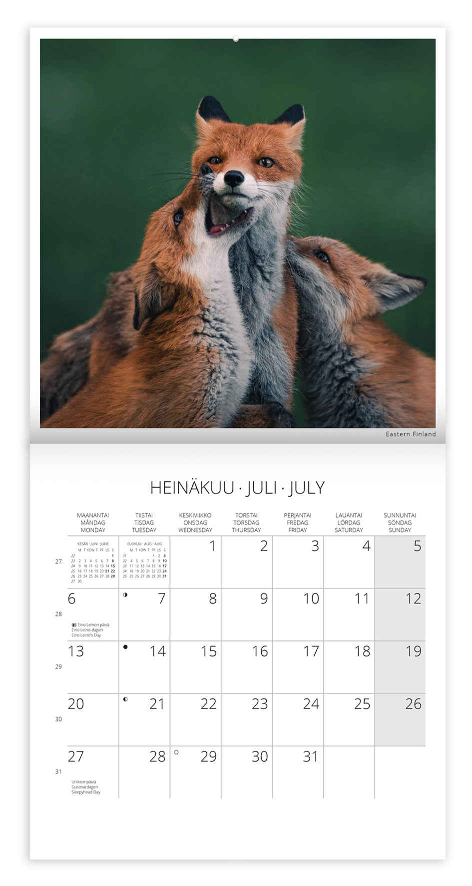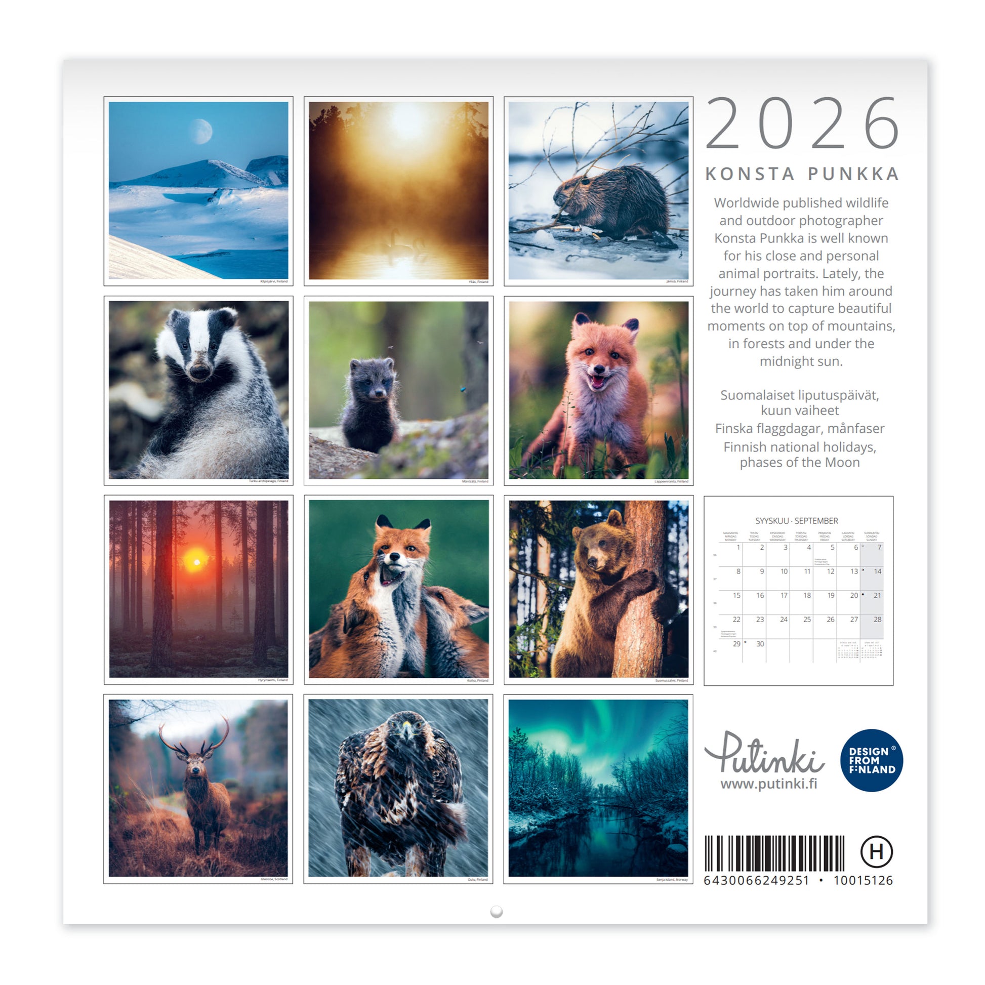 Pieni seinäkalenteri vuodelle 2026 tehty yhteistyössä valokuvaaja Konsta Punkan kanssa. Konsta Punkka -kalenteri on täynnä hurmaavan tunnelmallisia luontokuvia. Kannessa on saksanhirvi syksyisessä vuoristomaisemassa ja vuosiluku 2026 hopeafoliolla. Kielet: suomi, ruotsi ja englanti. Sisältää suomalaiset ja suomenruotsalaiset liputuspäivät, sekä kuun vaiheet. Koko 20 x 20 cm. Kalenterin alussa on yhdellä aukeamalla kuukaudet loka-, marras- ja joulukuu 2025. Sen voi siis ottaa jo käyttöön lokakuussa 2025!