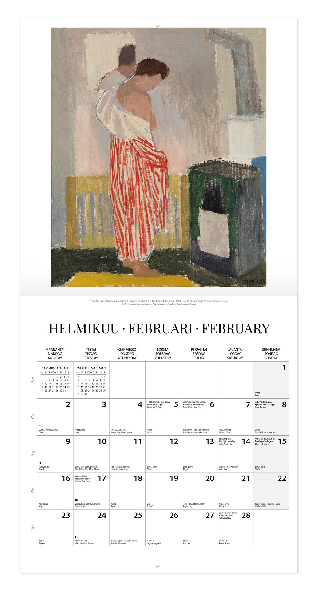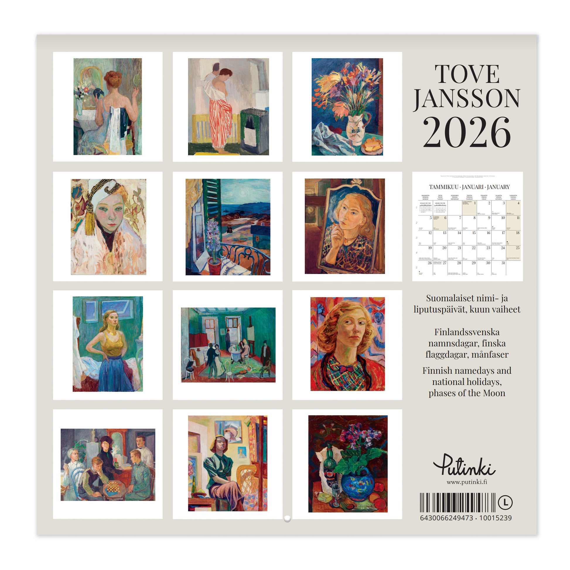 Seinäkalenteri 2026 jossa on kokoelma Tove Janssonin ihastuttavia teoksia. Kannessa on yksityiskohta maalauksesta "Ennen naamiaisia". Kielet: suomi, ruotsi ja englanti. Sisältää suomalaiset ja suomenruotsalaiset nimi- ja liputuspäivät, sekä kuun vaiheet. Koko 30 x 30 cm. Kalenterin alussa on yhdellä aukeamalla kuukaudet loka-, marras- ja joulukuu 2025. Sen voi siis ottaa jo käyttöön lokakuussa 2025! Sellofaanipakattu