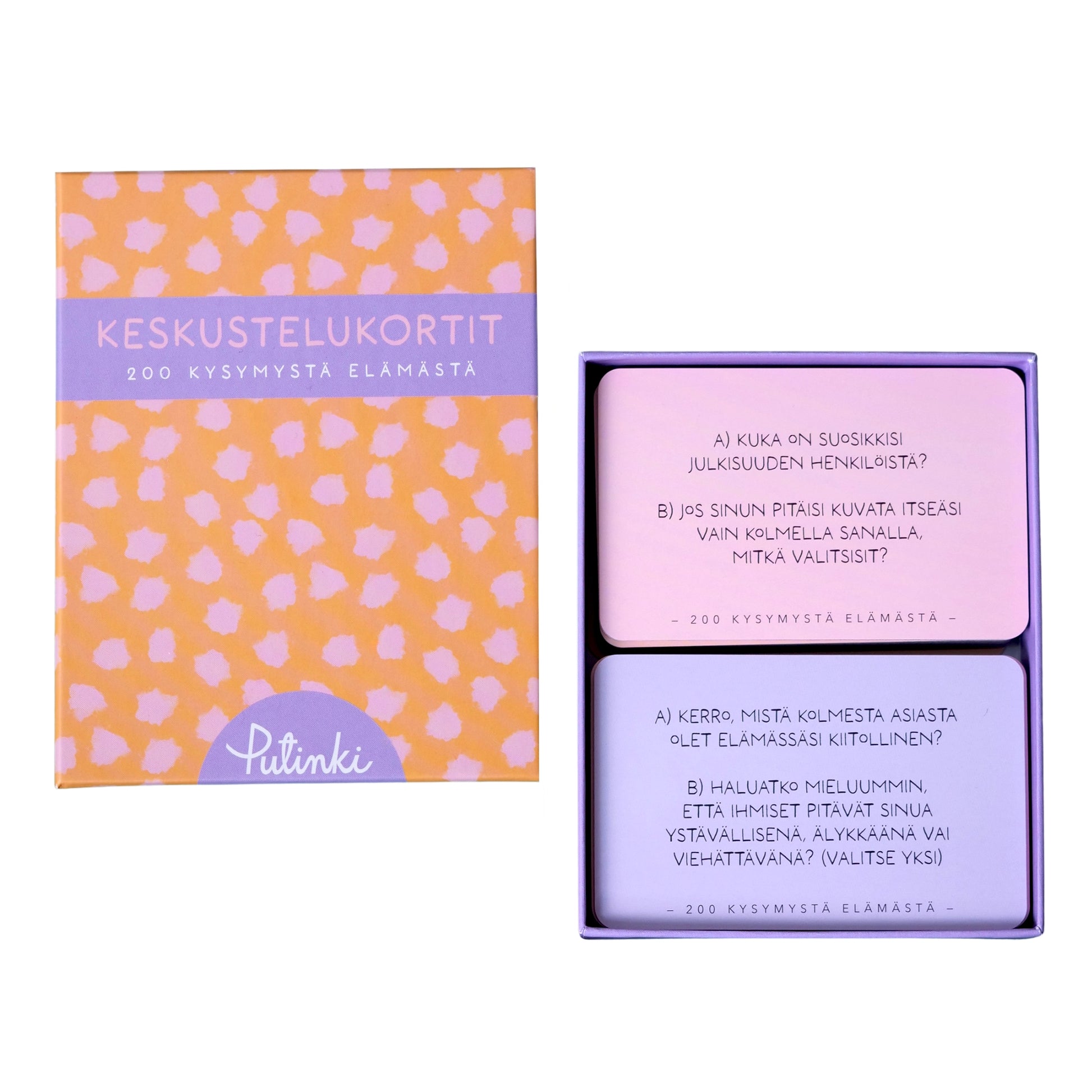 Tutustu ystäviisi ja perheeseesi syvemmin keskustelukorttien parissa! Putinki Designin luoma kiehtova pelipakka sisältää 200 kysymystä elämästä. Nappaa kortit peli-iltaan ja sukella mieleenpainuviin keskusteluihin ystäviesi tai perheen kanssa.