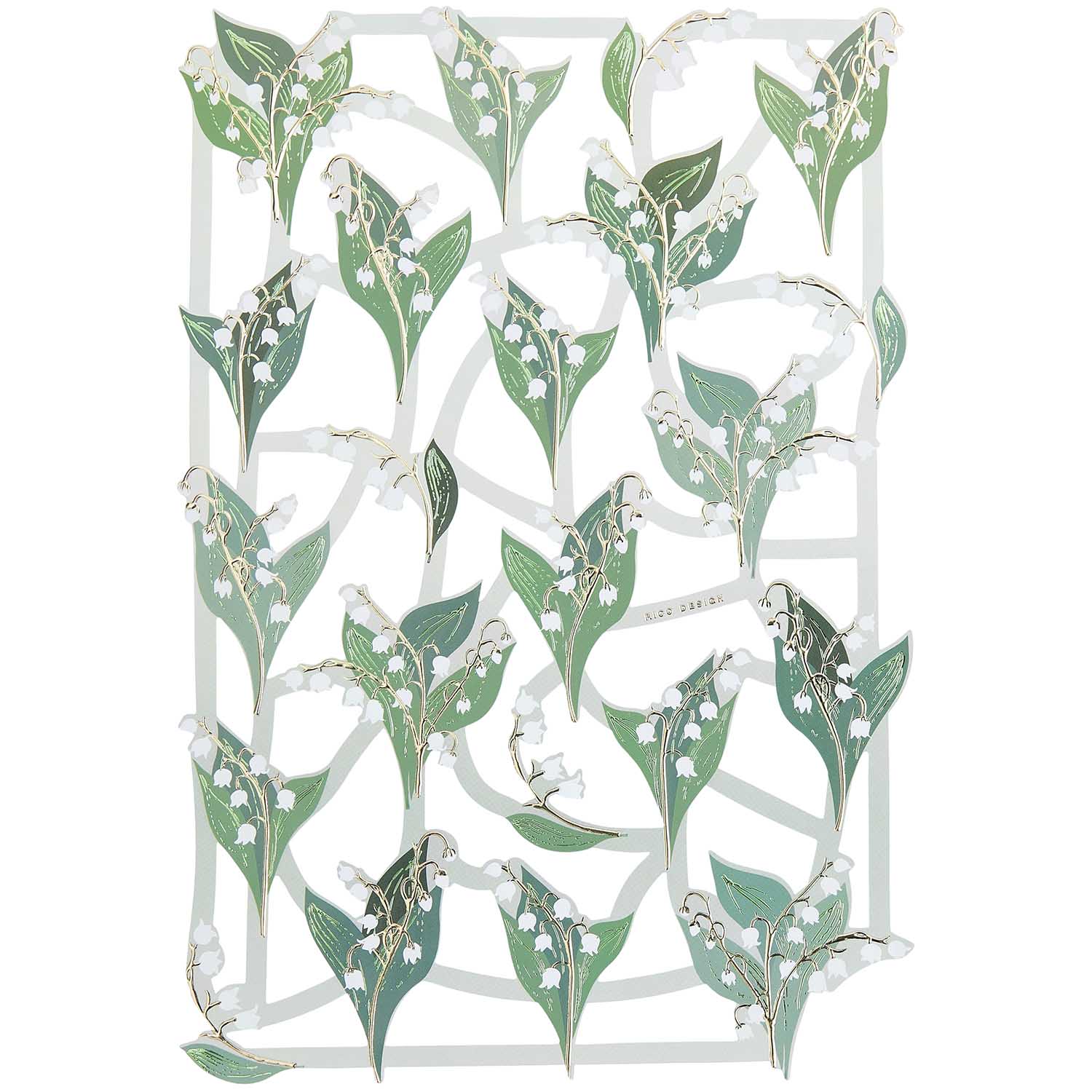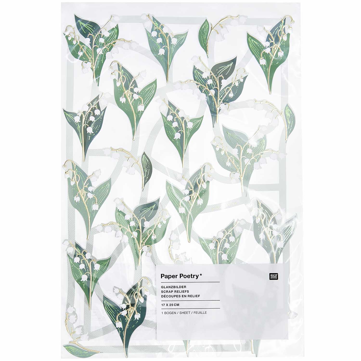 Kiiltokuva-arkki, kieloja 22 kpl., kuissa valkoiset kukat ja vihreät lehdet. Arkin koko 17 x 25 cm. Rico Design, Paper Poetry.