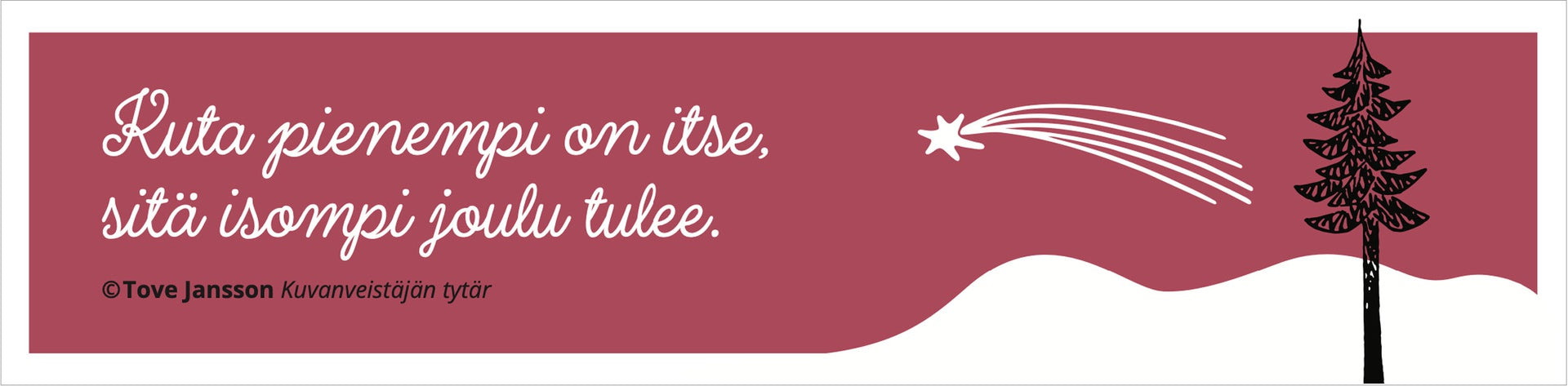 Kohopainettu kirjanmerkki laadukasta kartonkia. Kirjanmerkissä on sitaatti "Kuta pienempi on itse, sitä isompi joulu tulee." kirjasta Tove Jansson: Kuvanveistäjän tytär. Punaisella taustalla kuvassa tähdenlento ja kuusi. Koko 190 x 45 mm. Painettu Putingin omassa kohopainostudiossa Helsingissä. © Tove Janssonin kuolinpesä.