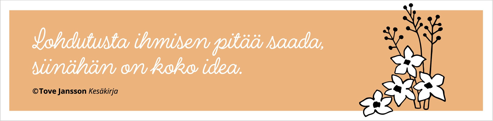 Kohopainettu kirjanmerkki laadukasta kartonkia. Kirjanmerkissä on sitaatti "Lohdutusta ihmisen pitää saada, siinähän on koko idea." kirjasta Tove Jansson: Kesäkirja. Keltaisella taustalla kuvassa piirretyt valkeat kukat. Koko 190 x 45 mm. Painettu Putingin omassa kohopainostudiossa Helsingissä.© Tove Janssonin kuolinpesä.