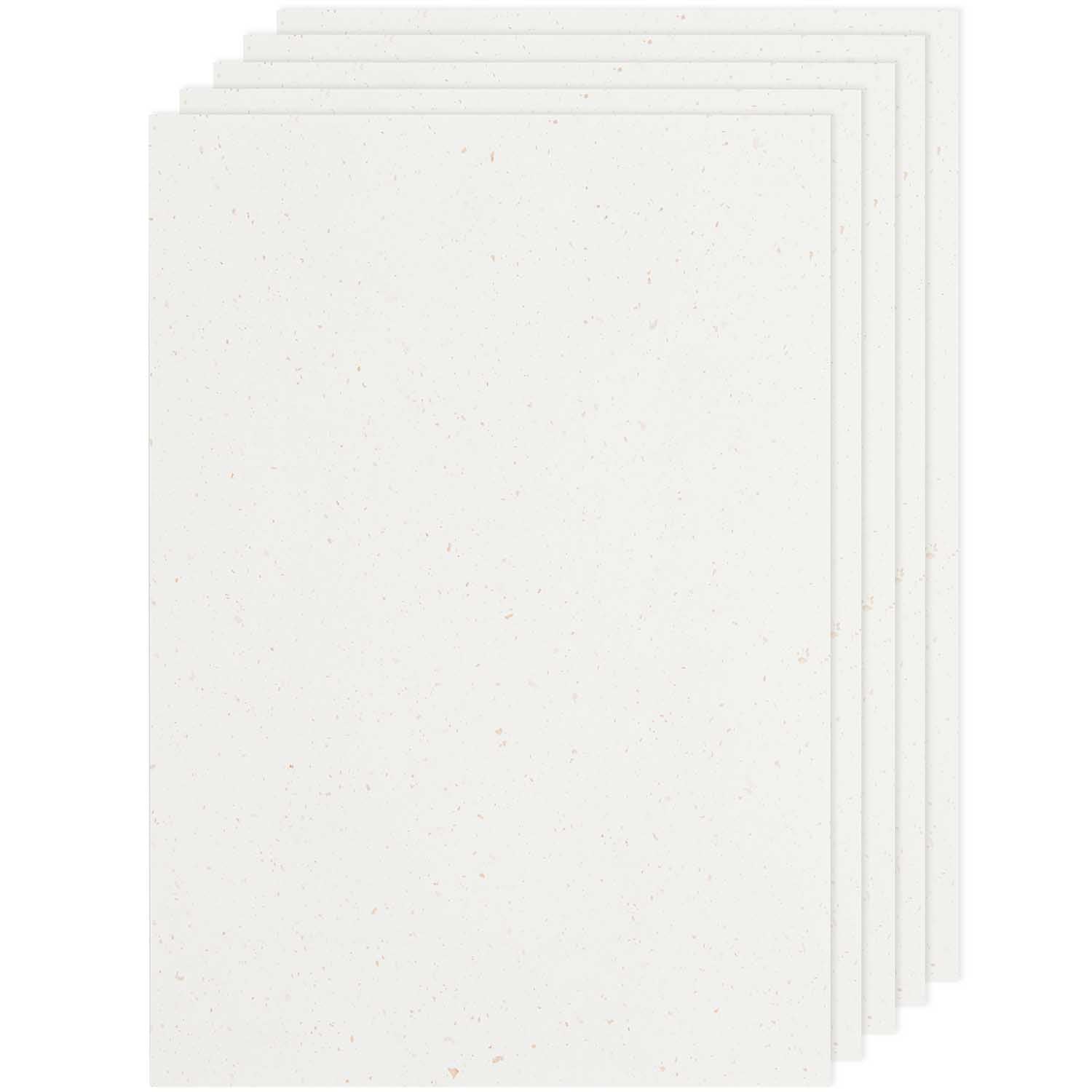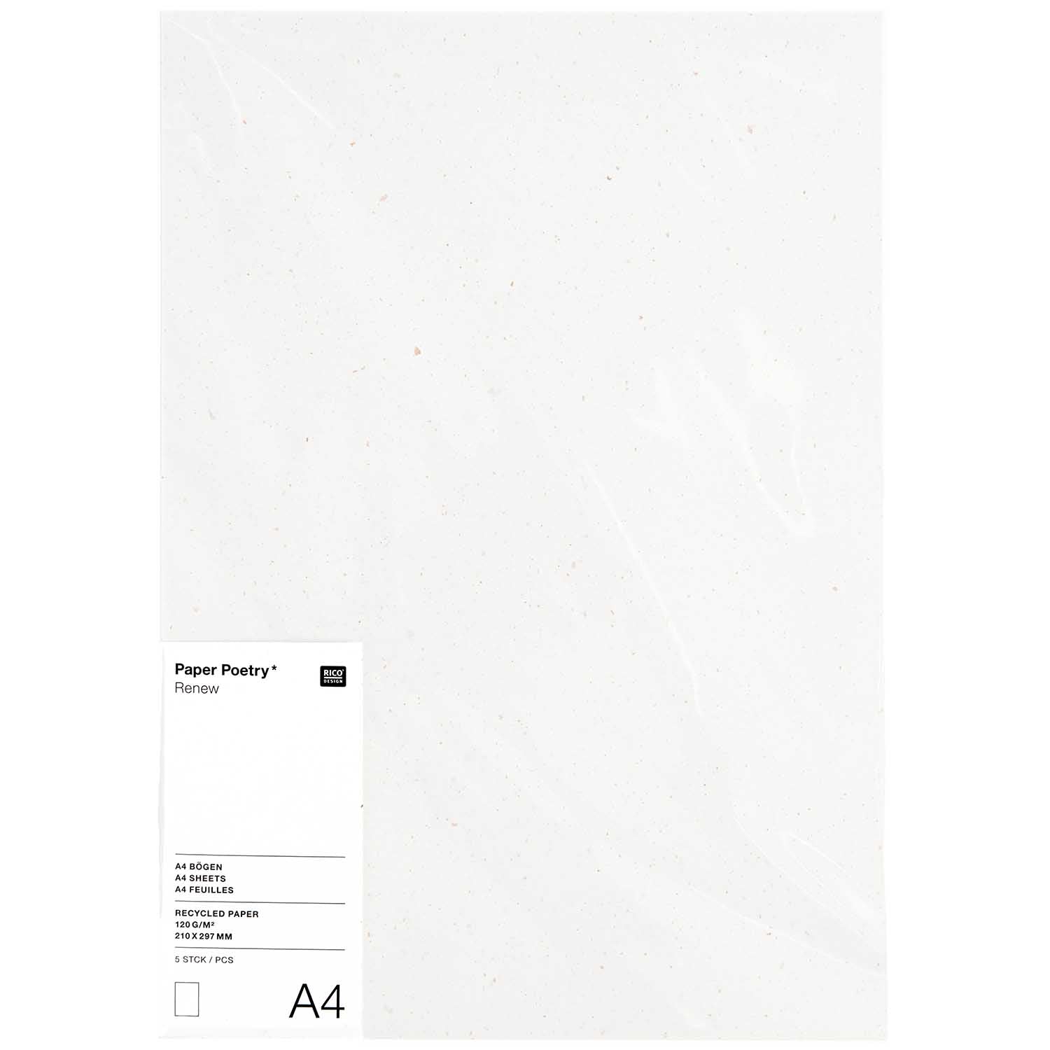 Rico Design Paper Poetry Renew kirjepaperi 5 kpl pakkauksessa. A4 (210 x 297 mm) kokoiset arkit ovat korkealaatuista 120 g/m2 paperia. Tämän kierrätyspaperin sävy on luonnonvalkoinen ja siinä on ruusukullan värisiä hippuja antaen paperille juhlavan ilmeen. Paperi soveltuu myös mustesuihku- ja lasertulostimeen.