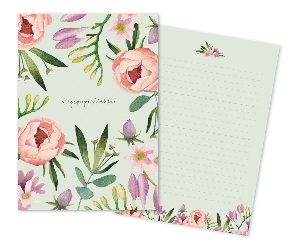 Kirjepaperilehtiö. Lehtiön koko on A4 ja siinä on 20 kuvioitua j viivoitettua irtirepäistävää arkkia. Vaaleanvihreällä pohjalla on ylä- ja alalaidassa kukkia. Paperin vahvuus 100 g. Design: Henna Adel.