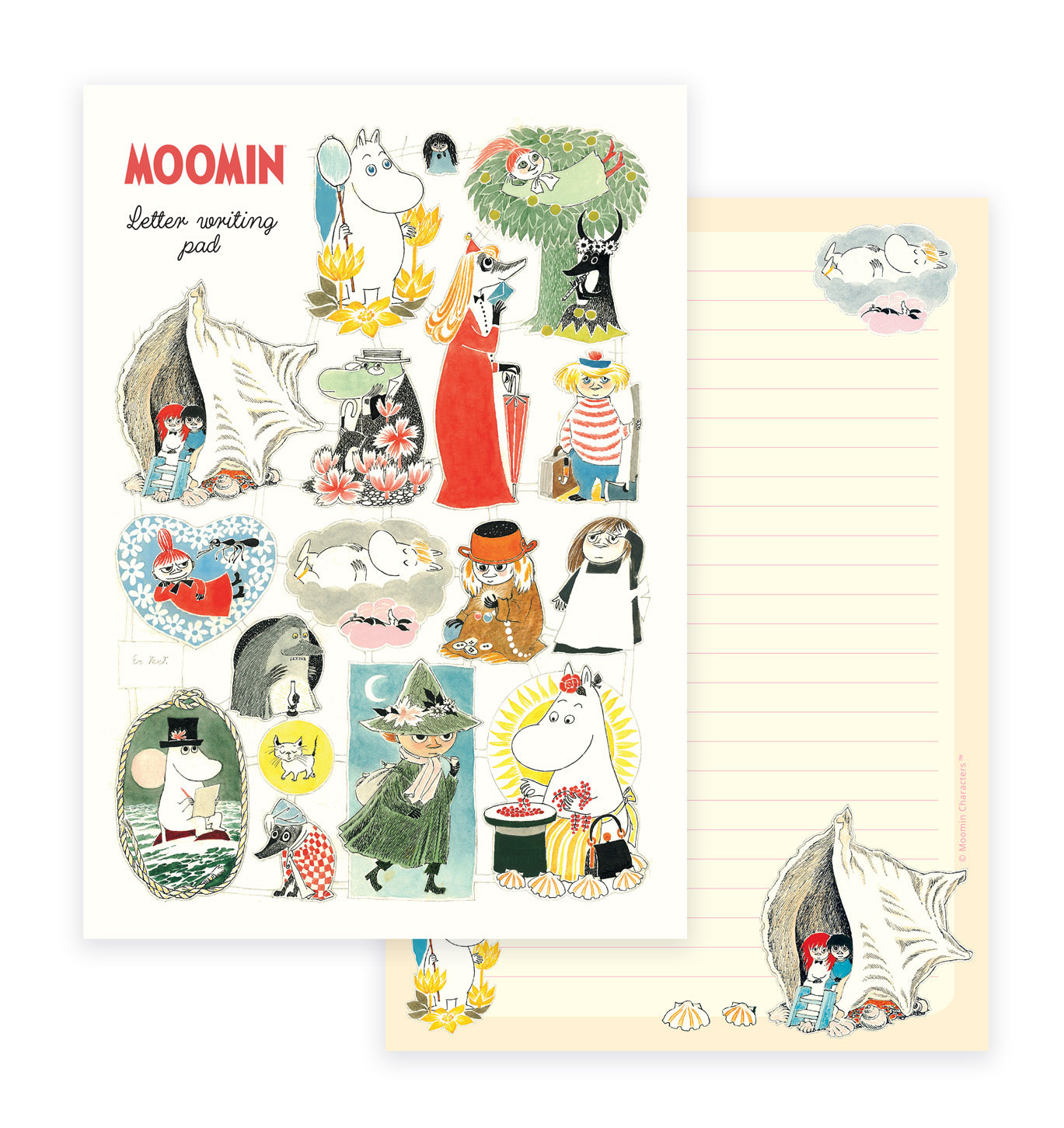 Kirjepaperilehtiö. Lehtiön koko on A4 ja siinä on 20 kuvioitua ja viivoitettua irtirepäistävää arkkia. Kuvioina Muumi-hahmoja kiiltokuvina. Paperin vahvuus 100 g. © Moomin Characters™