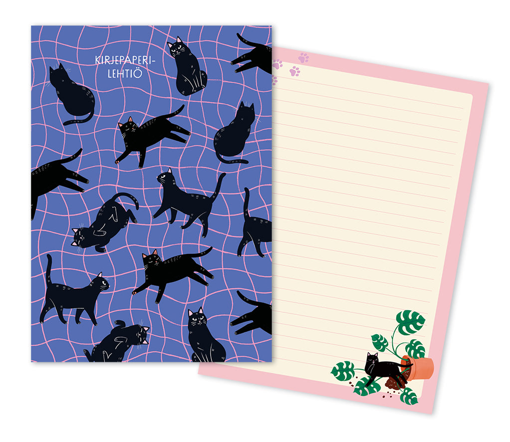 Kirjepaperilehtiö. Lehtiön koko on A4 ja siinä on 20 kuvioitua ja viivoitettua irtirepäistävää arkkia. Kuvana arkin alakulmassa Helvi-kissa kaatuneen kukkapurkin vieressä. Arkki on vaaleankeltainen ja siinä on vaaleanpunainen kehys. Paperin vahvuus 100 g. Design: Kaisu Sandberg.