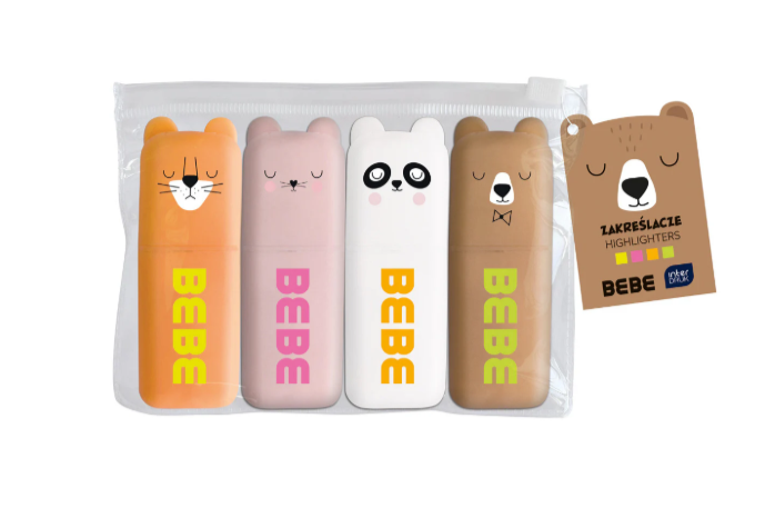 Minikokokoiset Bebe Friends korostustussit. Pakkauksessa on neljä eri eläinhahmoa. Design: Interdruk.