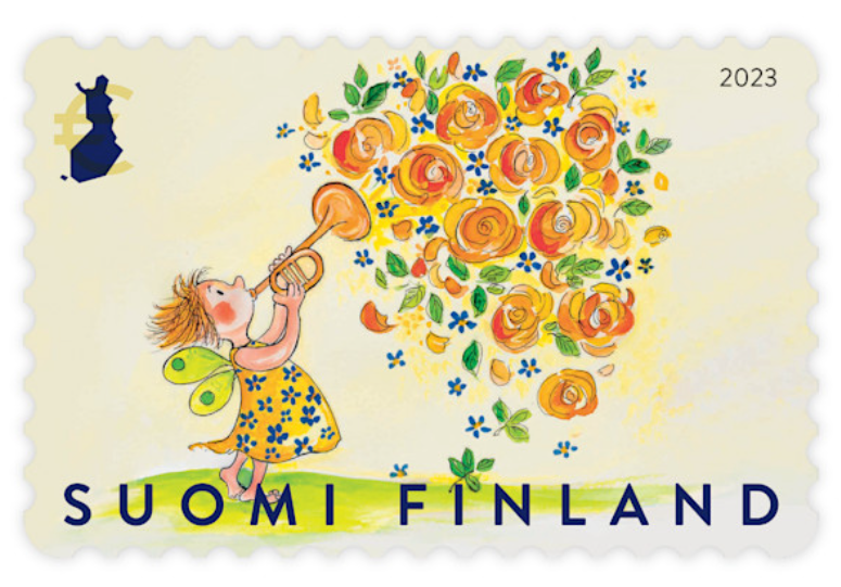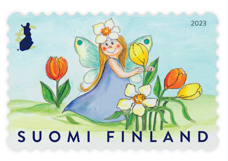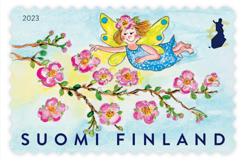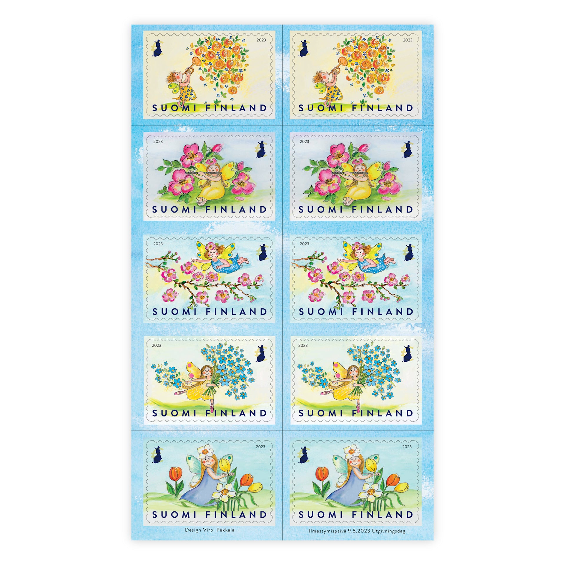 Kaikkiin tervehdyksiin ja juhlakutsuihin sopivat hyvin keijupostimerkit, jotka ovat rakastetun postikorttitaiteilija Virpi Pekkalan käsialaa. ”Keijut toimivat kevätpostimerkeissä onnittelujen ja juhlien seremoniamestareina ja soittavat keväälle fanfaarin.”