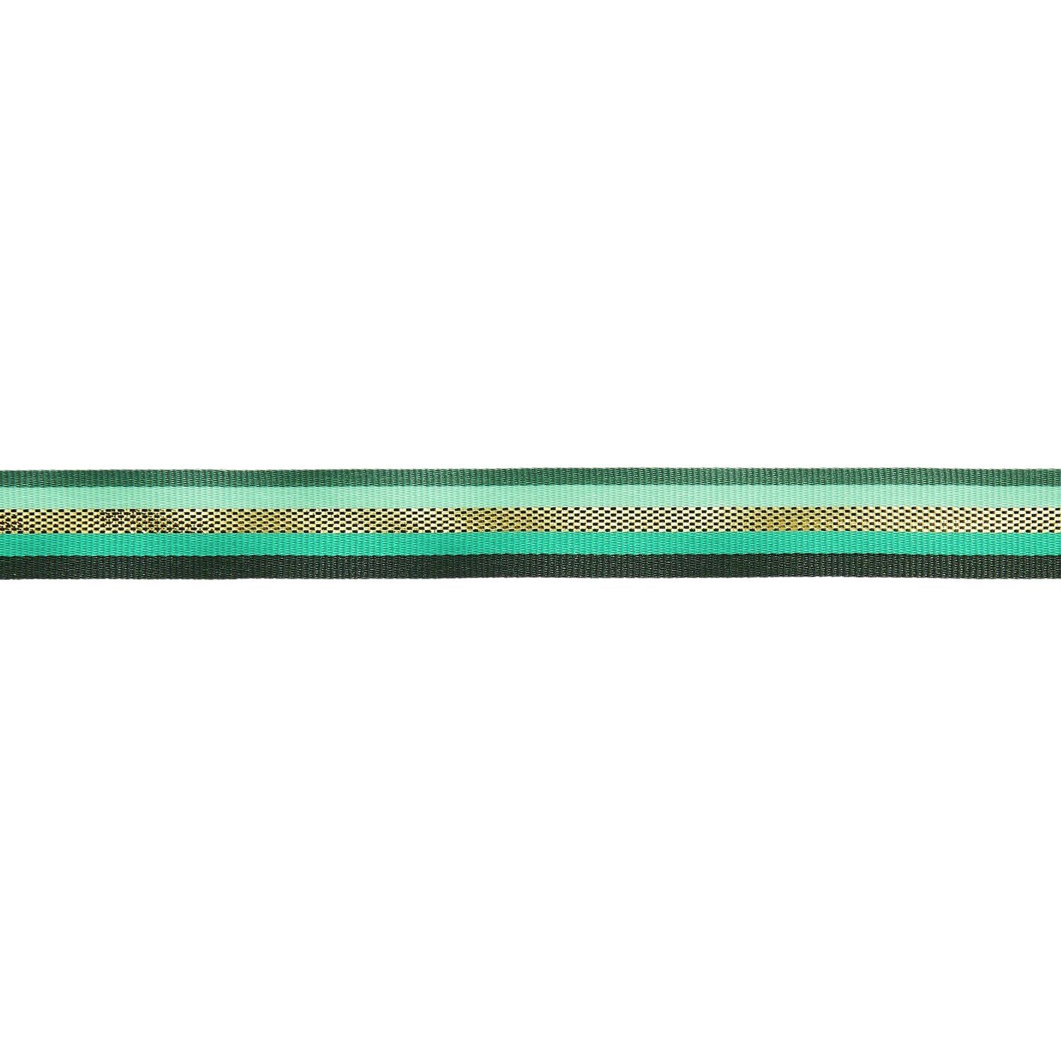 Rico Designin lahjanauha, jossa on vihreällä pohjalla eri sävyisiä vihreitä ja kullan värinen raita. Koko 13 mm / 3 m. Materiaali on Polyester-Nailon sekoite.