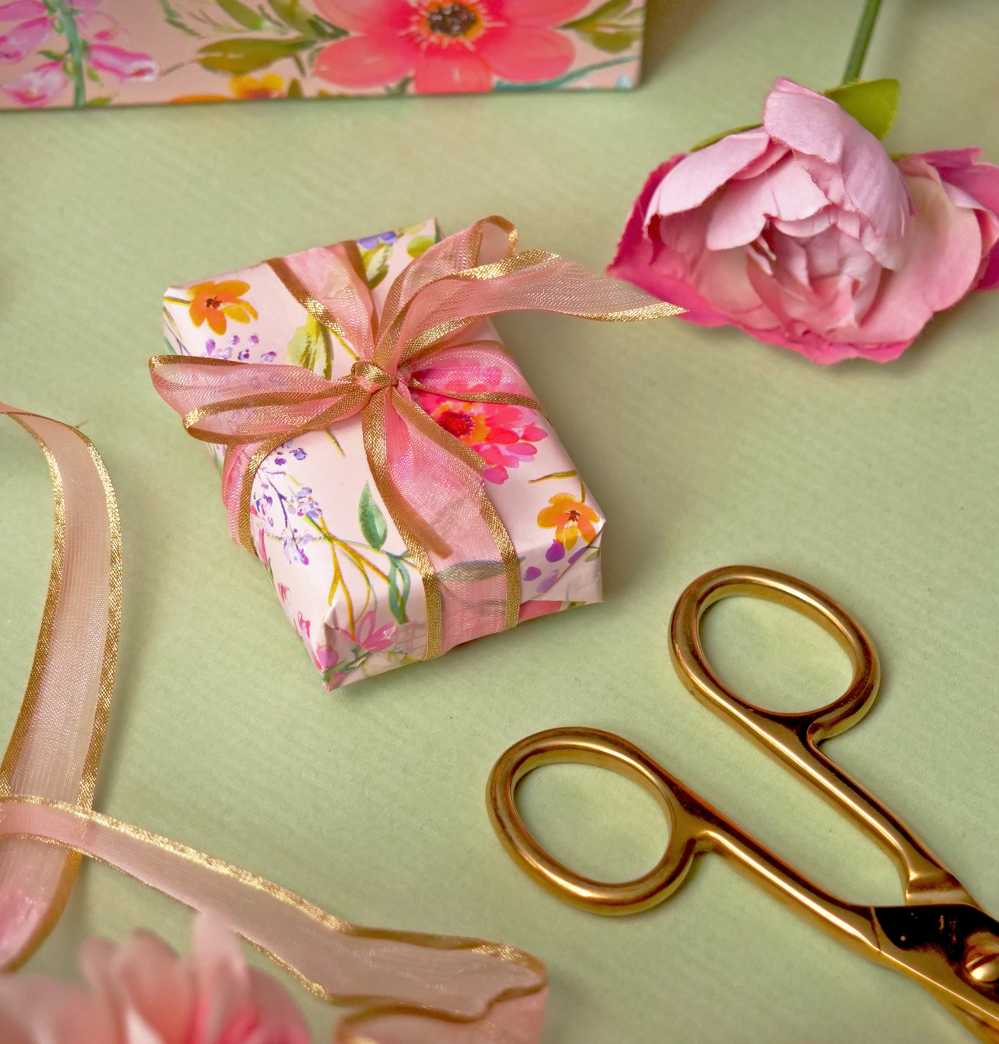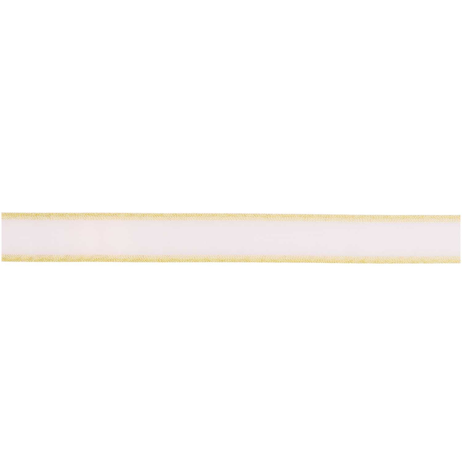 Rico Design vaaleanpunainen organzanauha kullan värisillä reunuksilla. Nauhan leveys on 16 mm ja rullassa 3 metriä nauhaa.